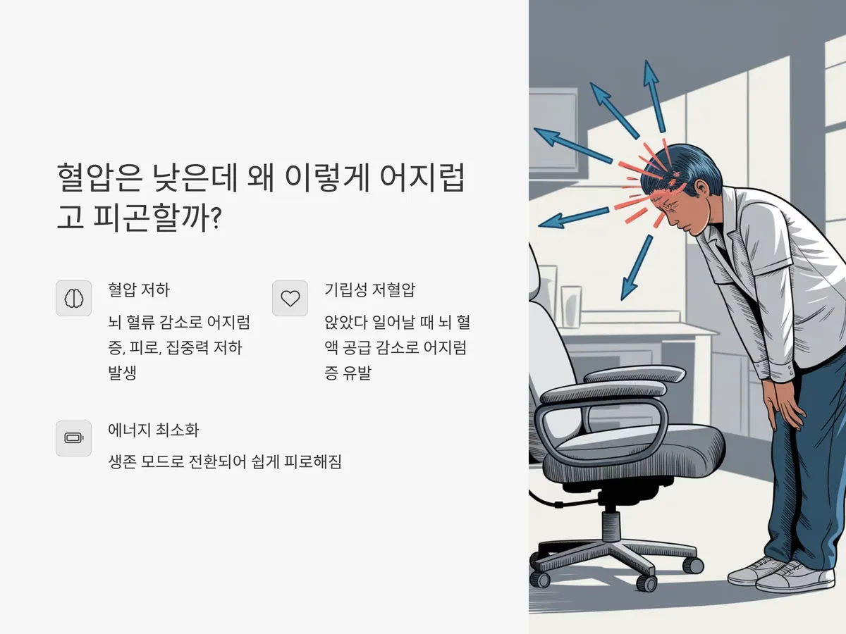 혈압이 낮다고 해서 반드시 건강하지 않다는 것은 잘못된 통념입니다. 실제로 정상혈압보다 낮지만 문제가 없는 경우도 있지만, 혈압 저하가 뇌 혈류 감소로 이어지면 어지럼증, 피로, 집중력 저하가 발생할 수 있습니다. 특히 기립성 저혈압은 앉았다 일어날 때 순간적으로 뇌에 혈액 공급이 줄어들면서 어지럼증을 유발합니다.