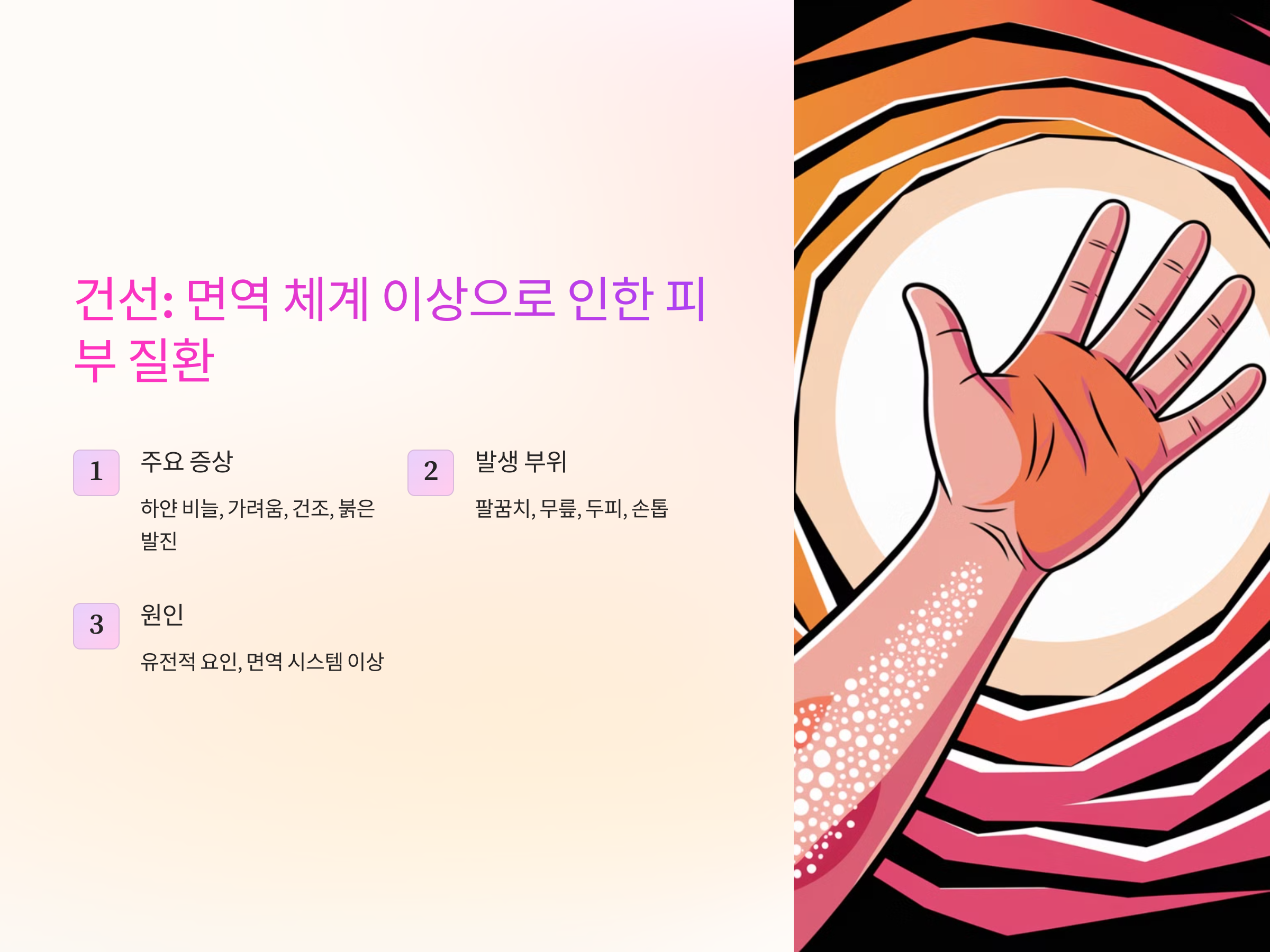 - 하얀 비늘: 피부 표면에 하얗거나 은색 비늘이 생깁니다.