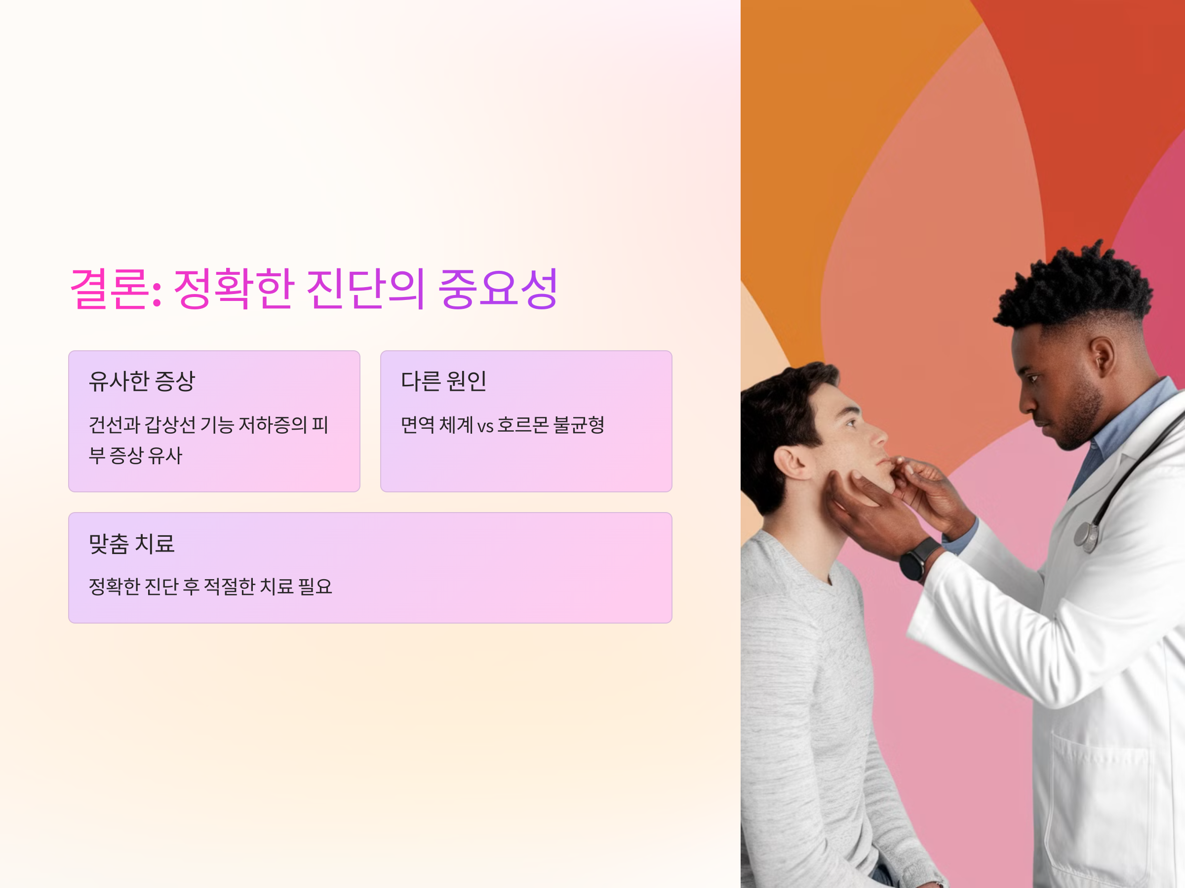 건선과 갑상선 기능 저하증은 증상에서 유사한 부분이 있지만, 그 원인과 치료법이 다릅니다. 피부 증상이 지속되거나 심해진다면, 반드시 전문가의 진단을 받아야 합니다. 정확한 치료를 통해 증상을 완화하고, 건강을 관리할 수 있습니다.