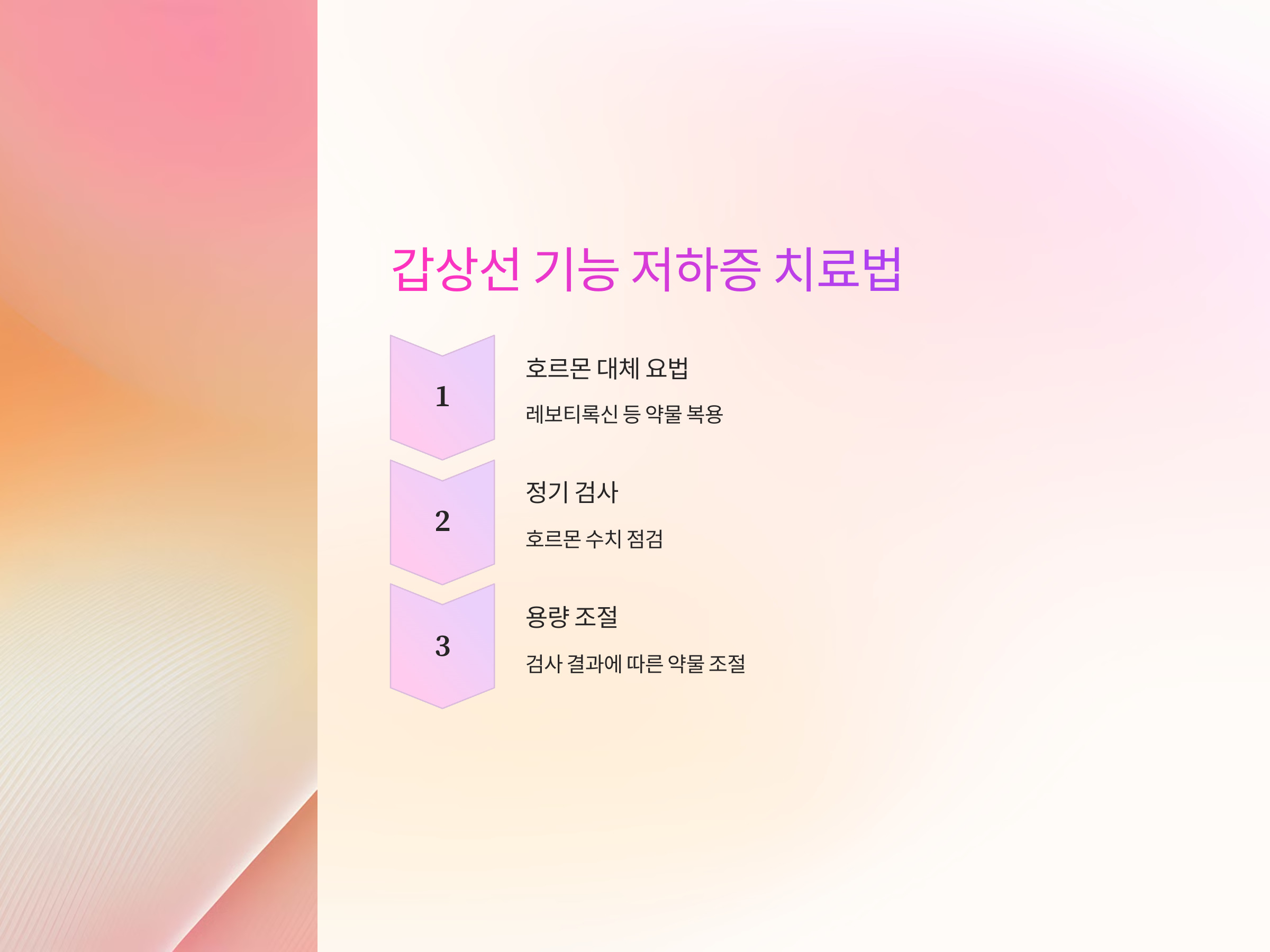 - 갑상선 기능 저하증 치료: 호르몬 보충 요법을 통해 갑상선 기능을 정상화하는 것이 치료의 핵심입니다.