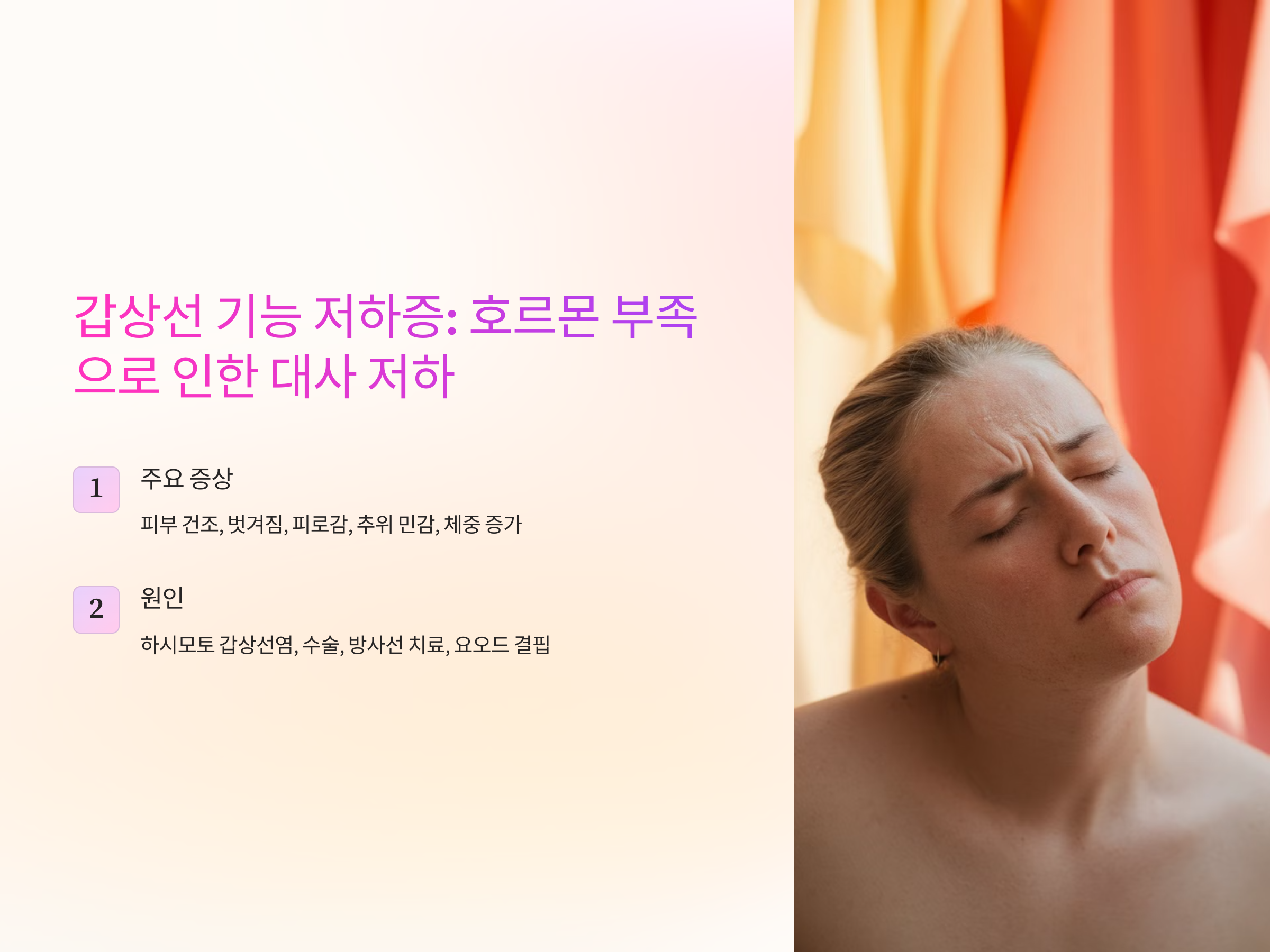갑상선 기능 저하증은 갑상선 호르몬의 분비가 부족하여 신체의 대사 기능이 저하되는 질환입니다. 갑상선 호르몬은 체온 조절, 심박수, 체중 등에 중요한 영향을 미칩니다. 갑상선 기능 저하증이 있으면 다양한 증상이 나타날 수 있으며, 그 중 하나가 피부 건조와 가려움증입니다.