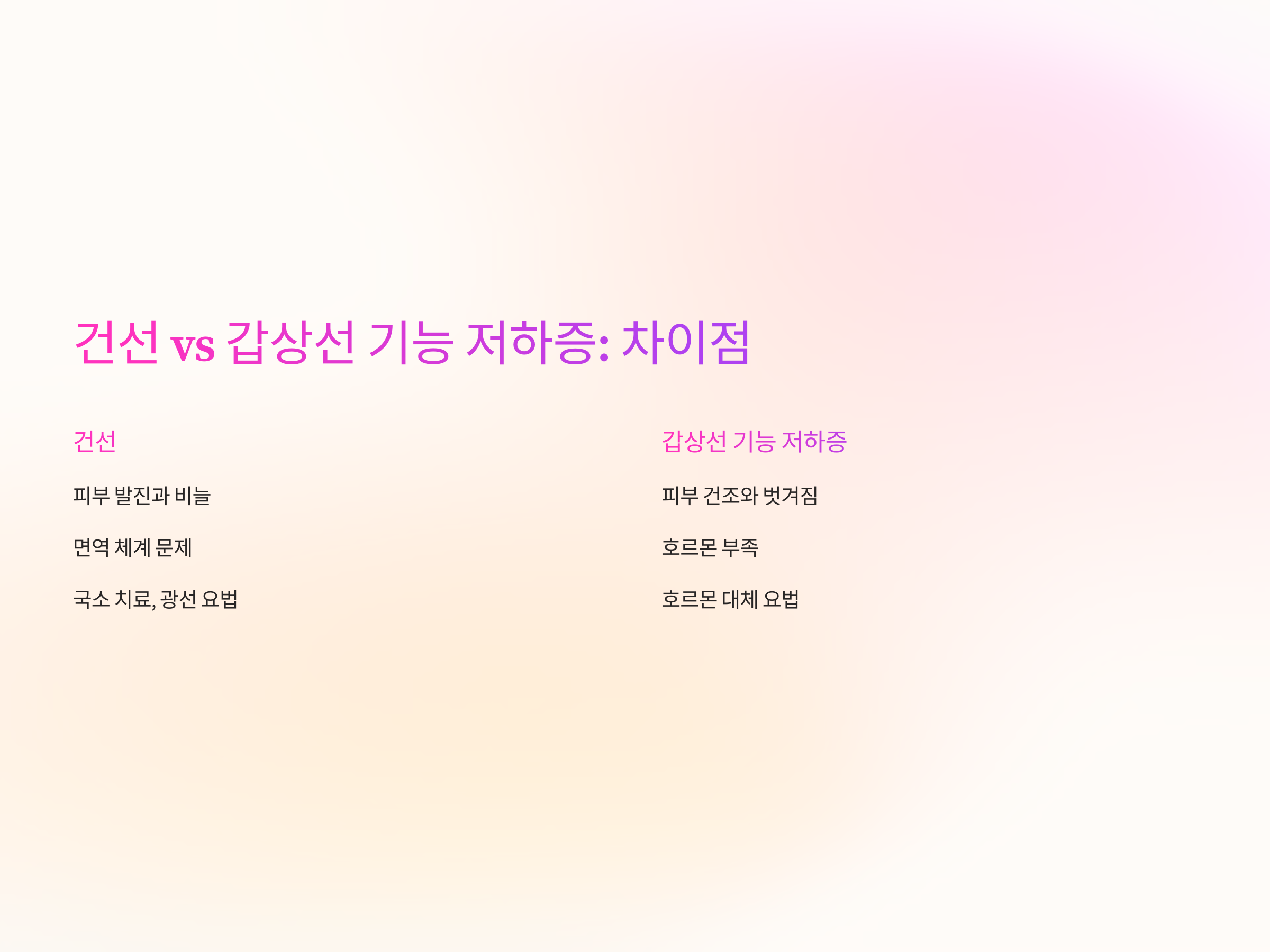 피부 가려움증과 건조함은 건선과 갑상선 기능 저하증 모두에서 나타날 수 있는 증상이지만, 두 질환의 원인과 치료 방법은 다릅니다. 건선은 주로 면역 체계의 문제로 발생하며, 갑상선 기능 저하증은 호르몬 부족으로 인한 대사 저하가 원인입니다. 정확한 진단을 위해 전문가의 상담을 받는 것이 매우 중요합니다.