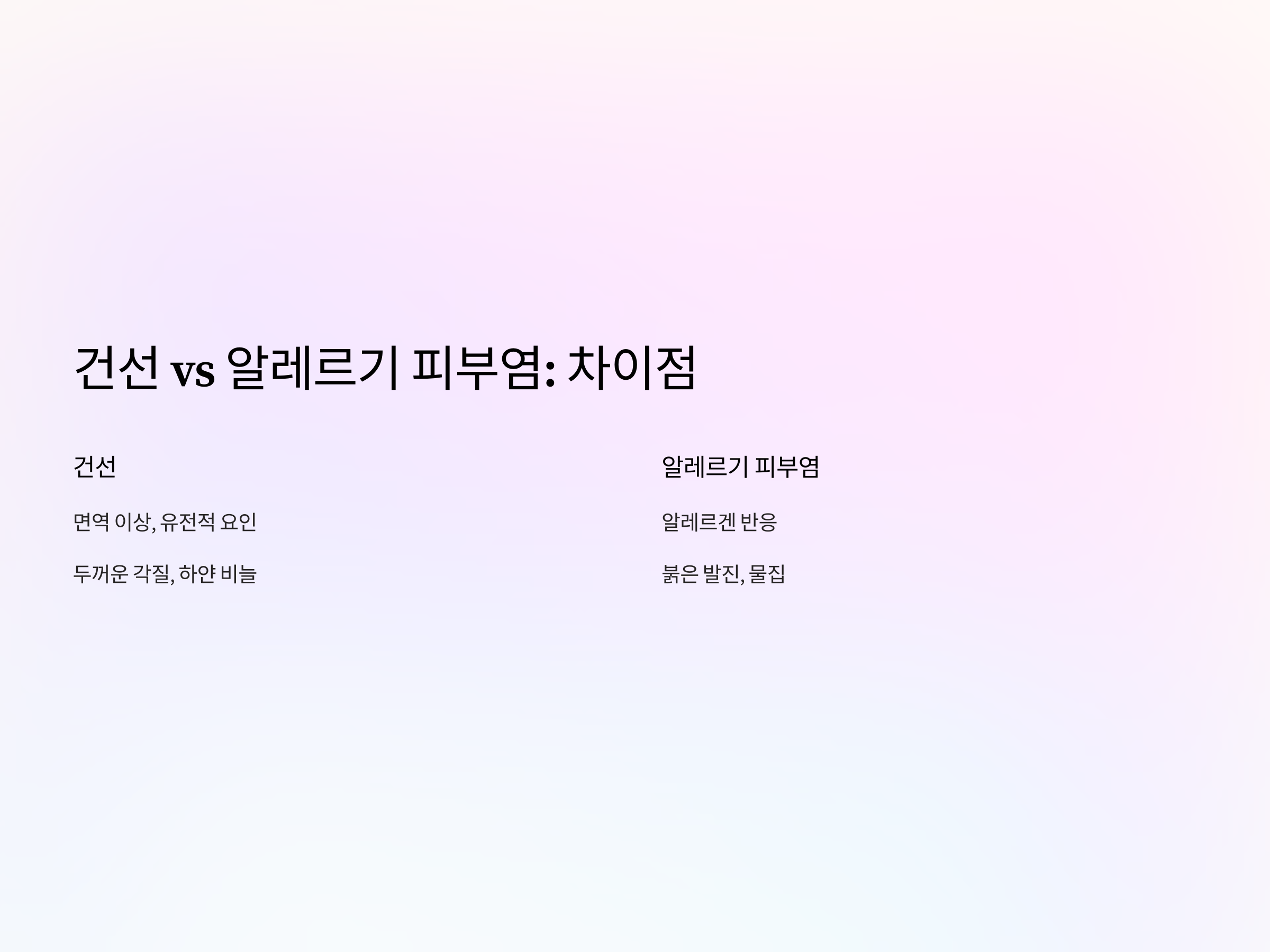 건선은 두꺼운 각질이 쌓이며, 주로 팔꿈치나 무릎, 두피에 발생합니다. 반면, 알레르기 피부염은 주로 발진이 붉고, 물집이나 습진이 동반됩니다.