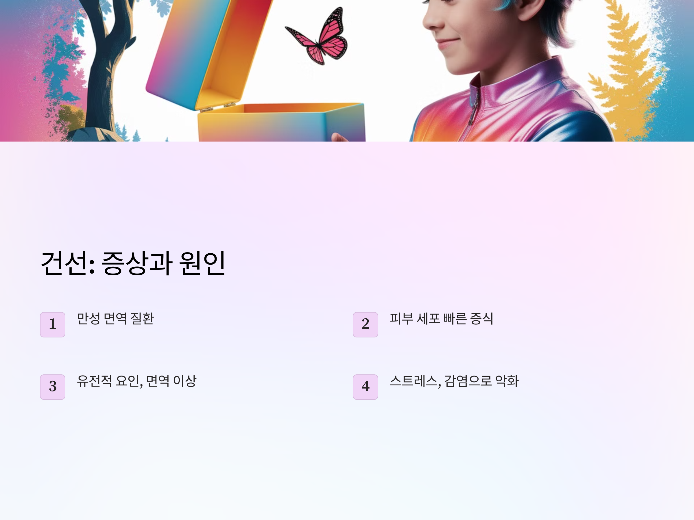 - 건선은 면역 체계의 이상으로 발생하는 만성 질환이며, 유전적 요인도 중요한 역할을 합니다.