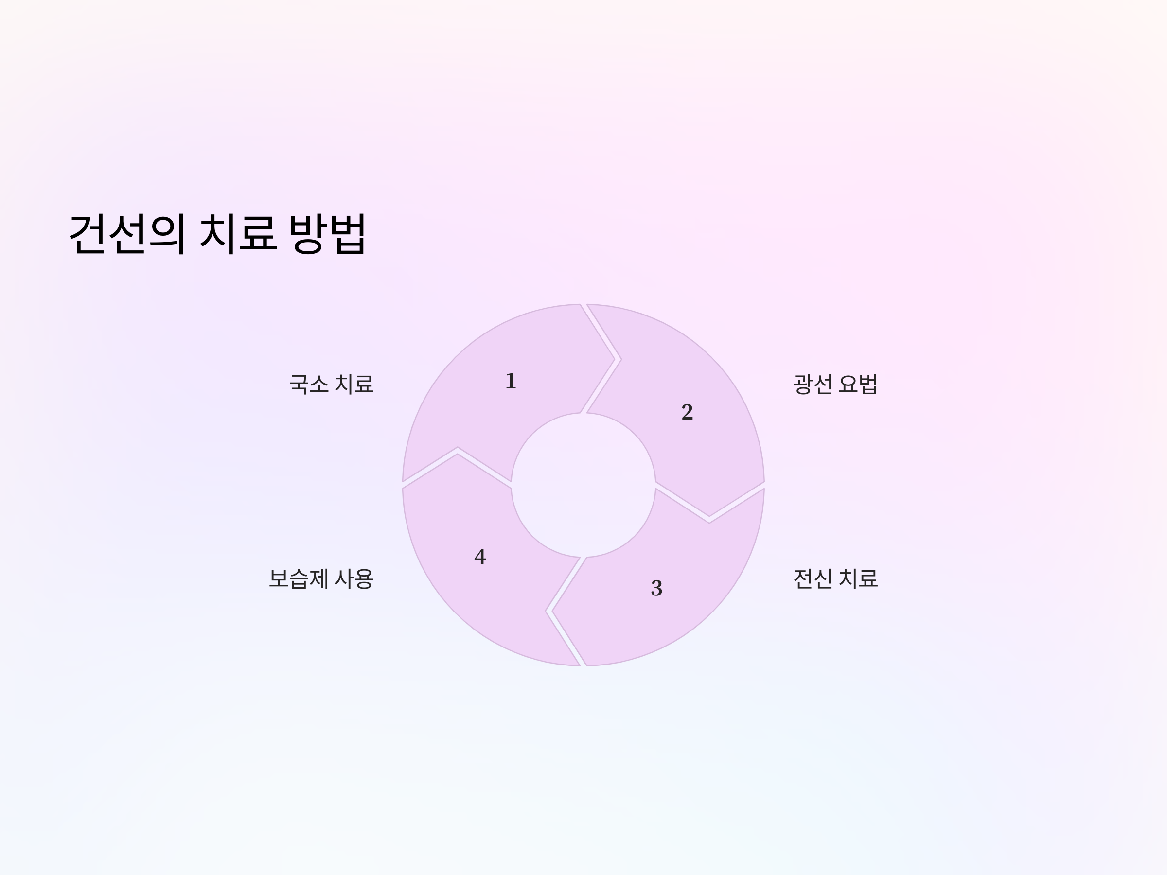 건선은 완치가 어려운 만성 질환이기 때문에, 지속적인 관리가 필요합니다. 건선의 치료 방법은 주로 증상의 경감을 목표로 하며, 여러 가지 방법이 있습니다.