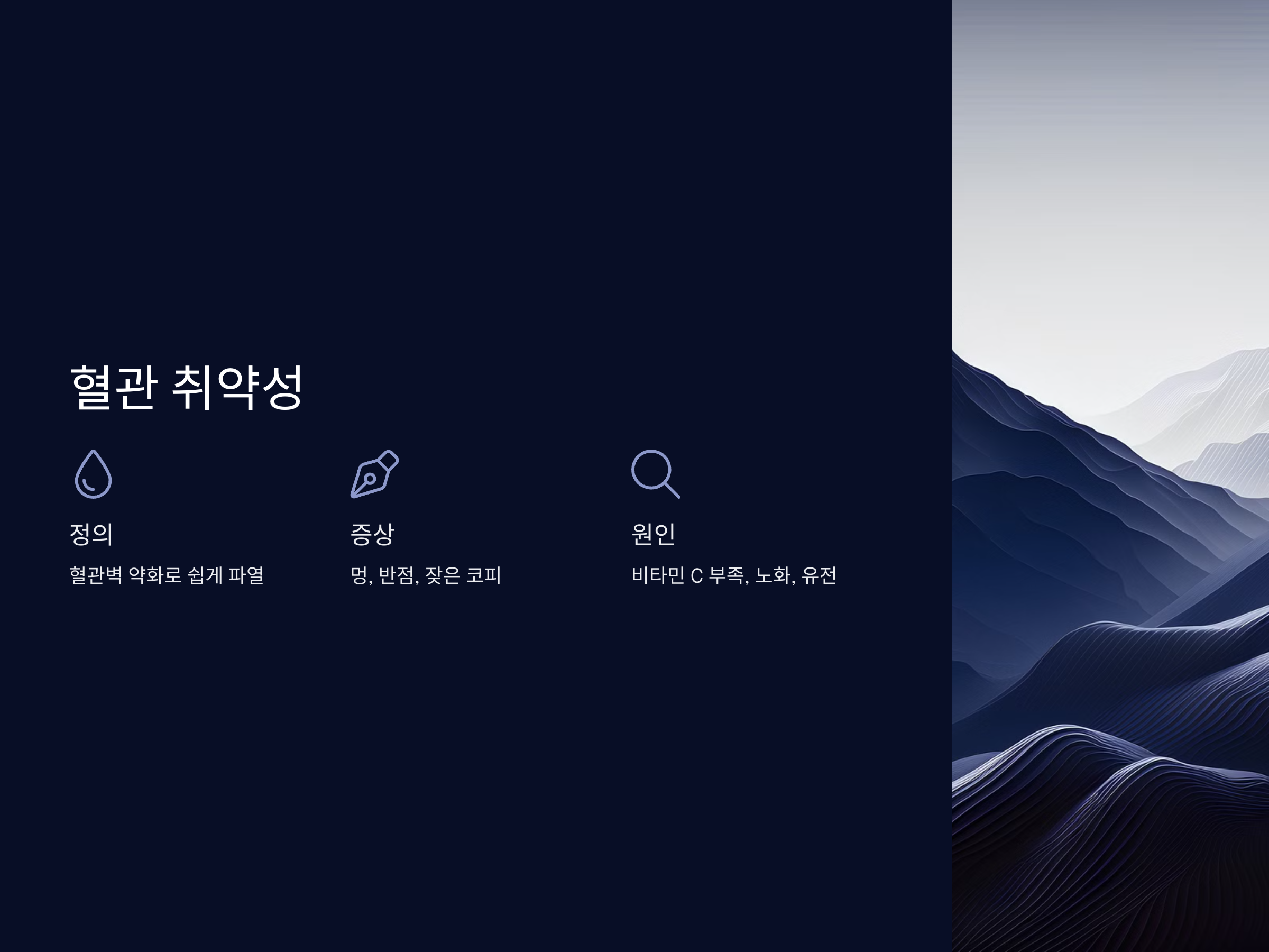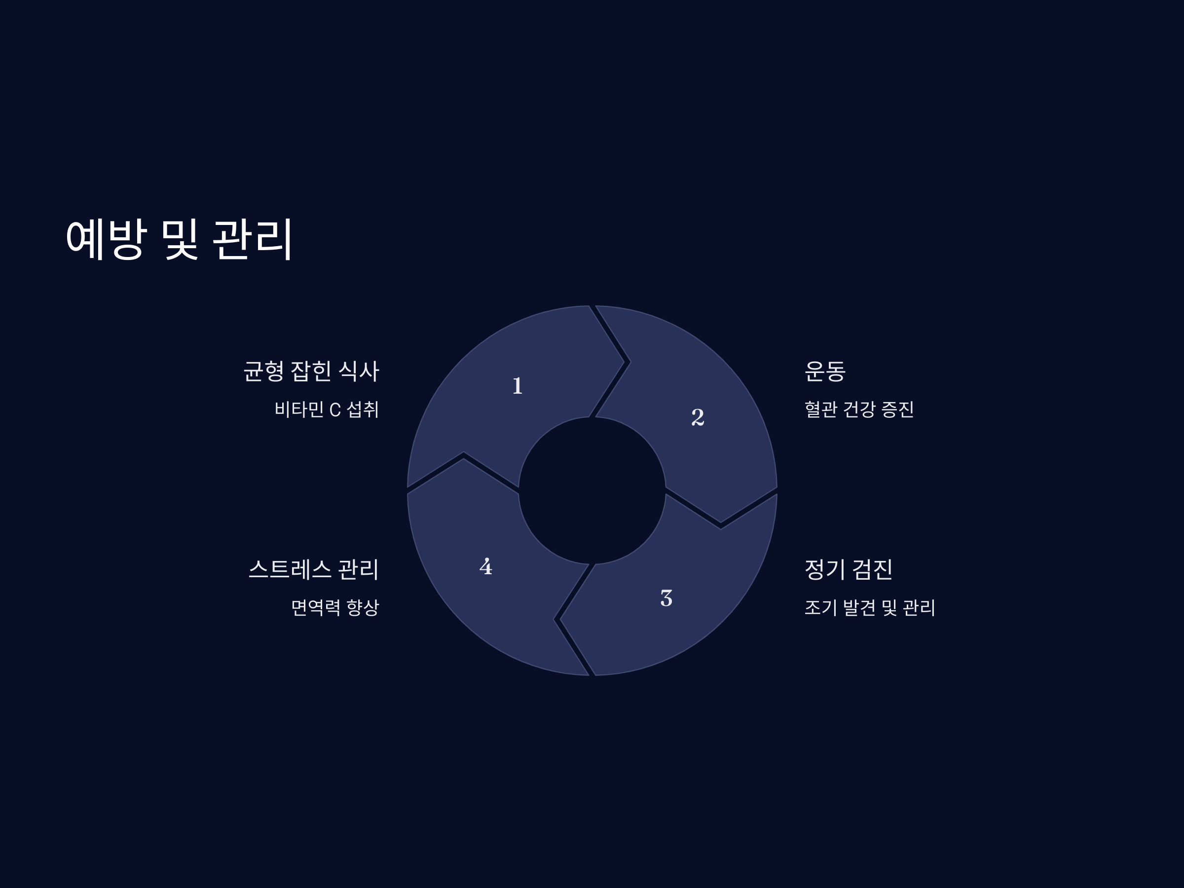 혈관 취약성은 비타민 C 섭취를 충분히 하고, 균형 잡힌 식사를 유지하는 것이 중요합니다. 또한, 혈관 건강을 위한 운동과 정기적인 건강 검진이 도움이 될 수 있습니다.