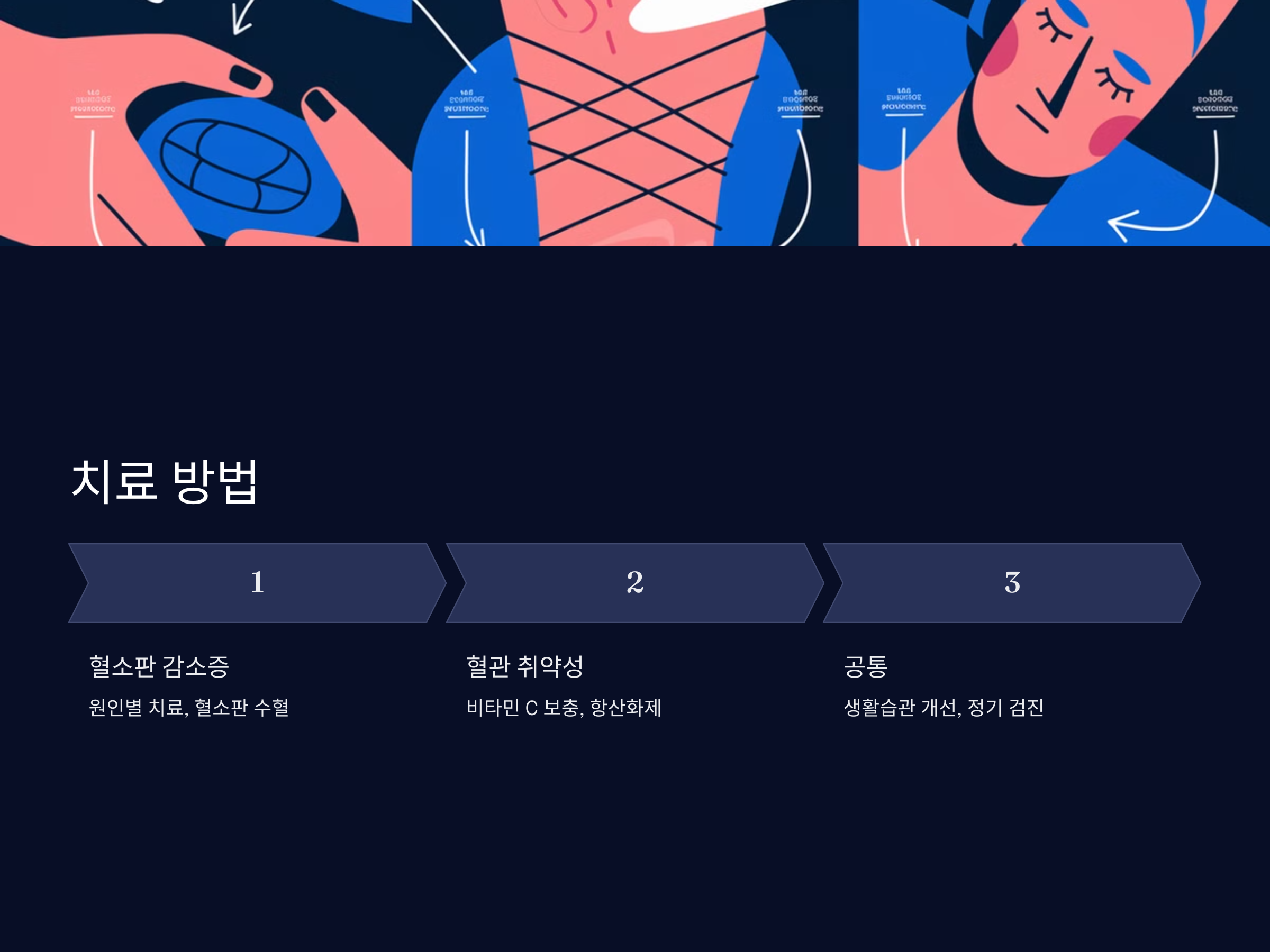 피부에 검붉은 반점이나 멍이 쉽게 드는 증상은 매우 흔하게 발생할 수 있지만, 그 원인에 따라 치료 방법이 달라집니다. 혈소판 감소증과 혈관 취약성의 차이를 잘 이해하고, 각 상태에 맞는 적절한 치료를 받는 것이 중요합니다. 자주 이런 증상이 나타난다면 전문가와 상담하여 정확한 원인을 파악하고, 그에 맞는 치료를 받으시길 바랍니다.