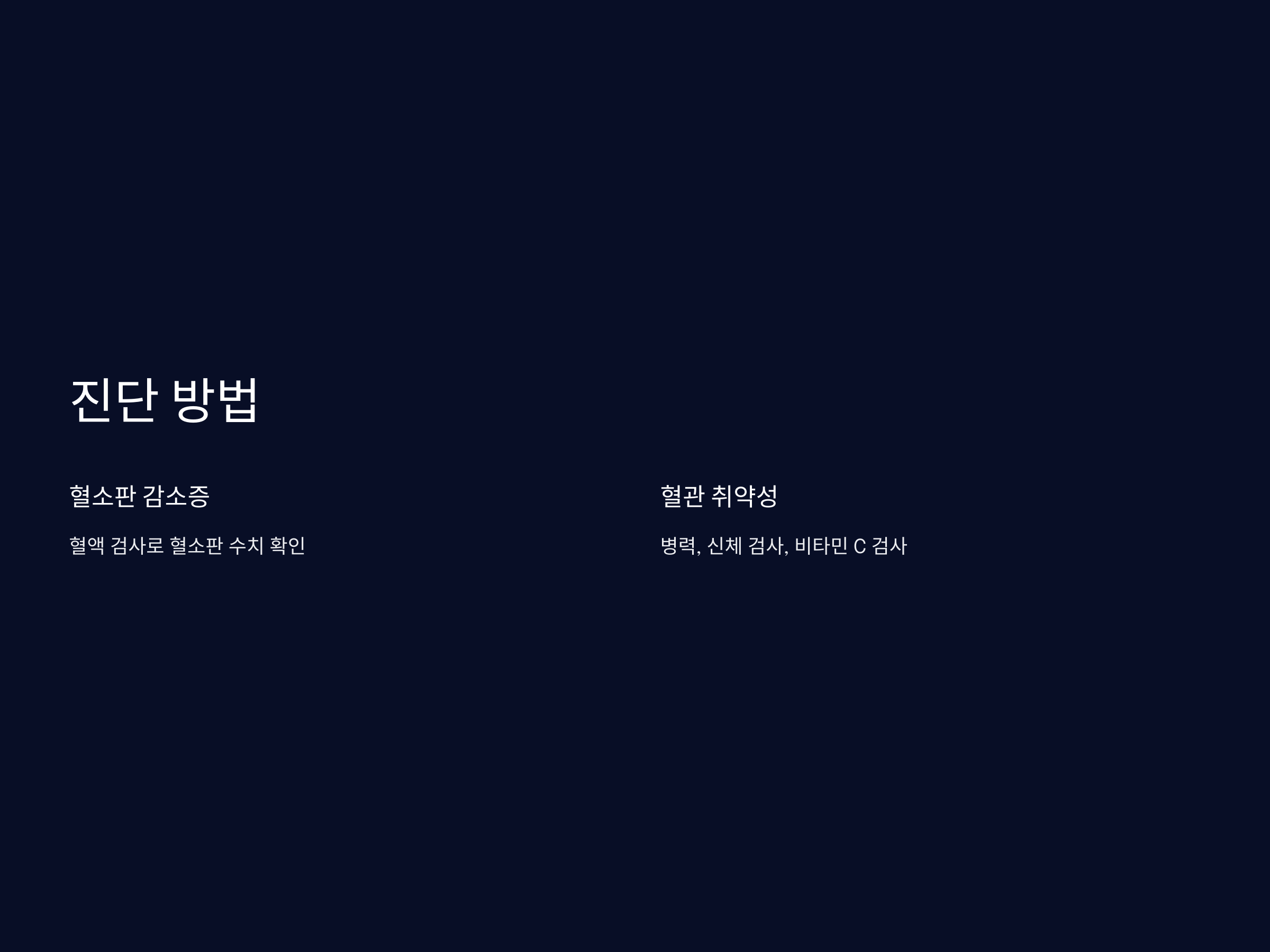 | 원인 | 혈소판 수치 감소 | 혈관벽의 약화 |