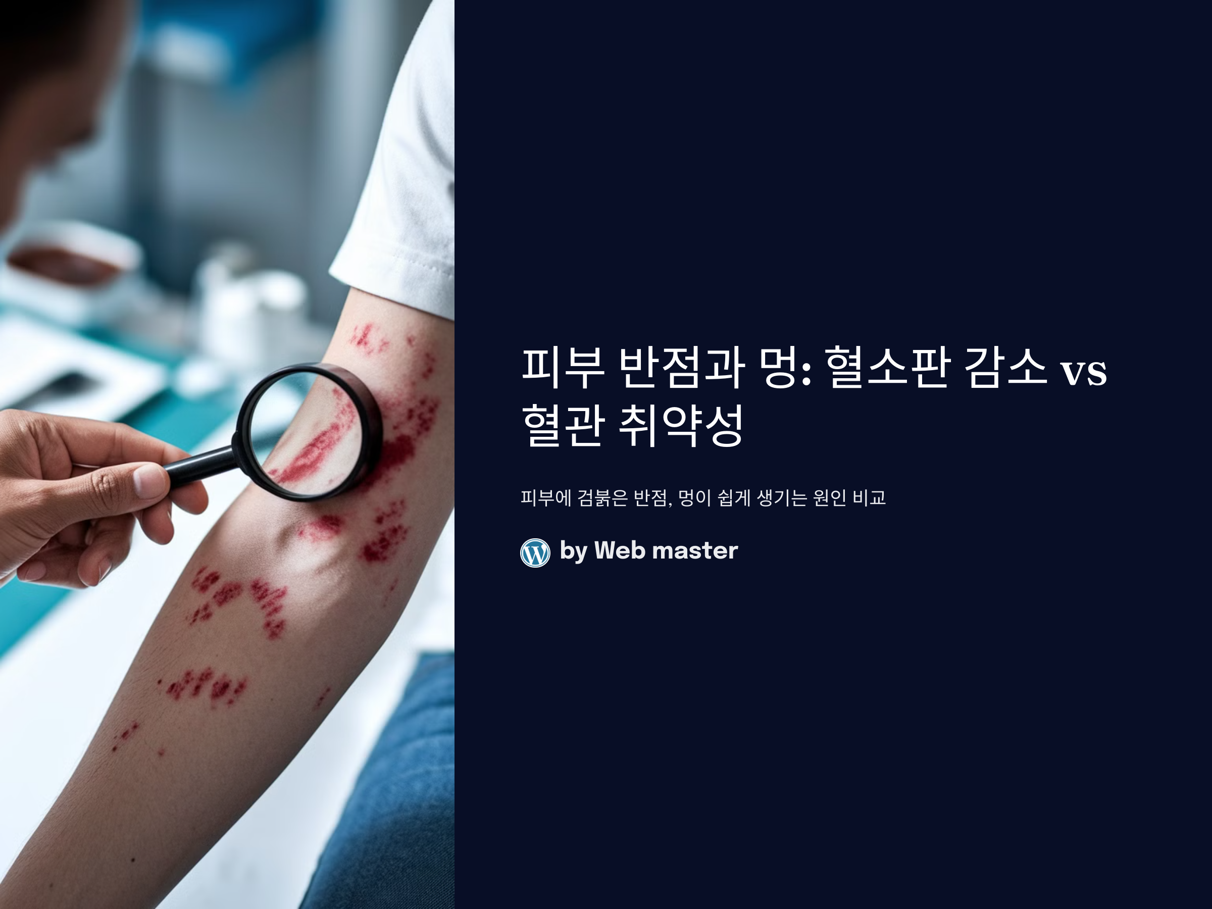 피부에 검붉은 반점이나 멍이 쉽게 드는 증상은 혈소판 감소증과 혈관 취약성 두 가지 주요 원인에 의해 발생할 수 있습니다. 이 두 가지 상태는 비슷한 증상을 보이지만, 원인과 치료 방법은 크게 다릅니다. 혈소판 감소증은 혈액 응고를 돕는 혈소판이 부족한 상태이며, 혈관 취약성은 혈관 벽이 약해져 쉽게 출혈이 발생하는 상태입니다. 각각의 원인에 맞는 치료를 통해 증상을 완화시킬 수 있으므로, 정확한 진단을 받는 것이 중요합니다.