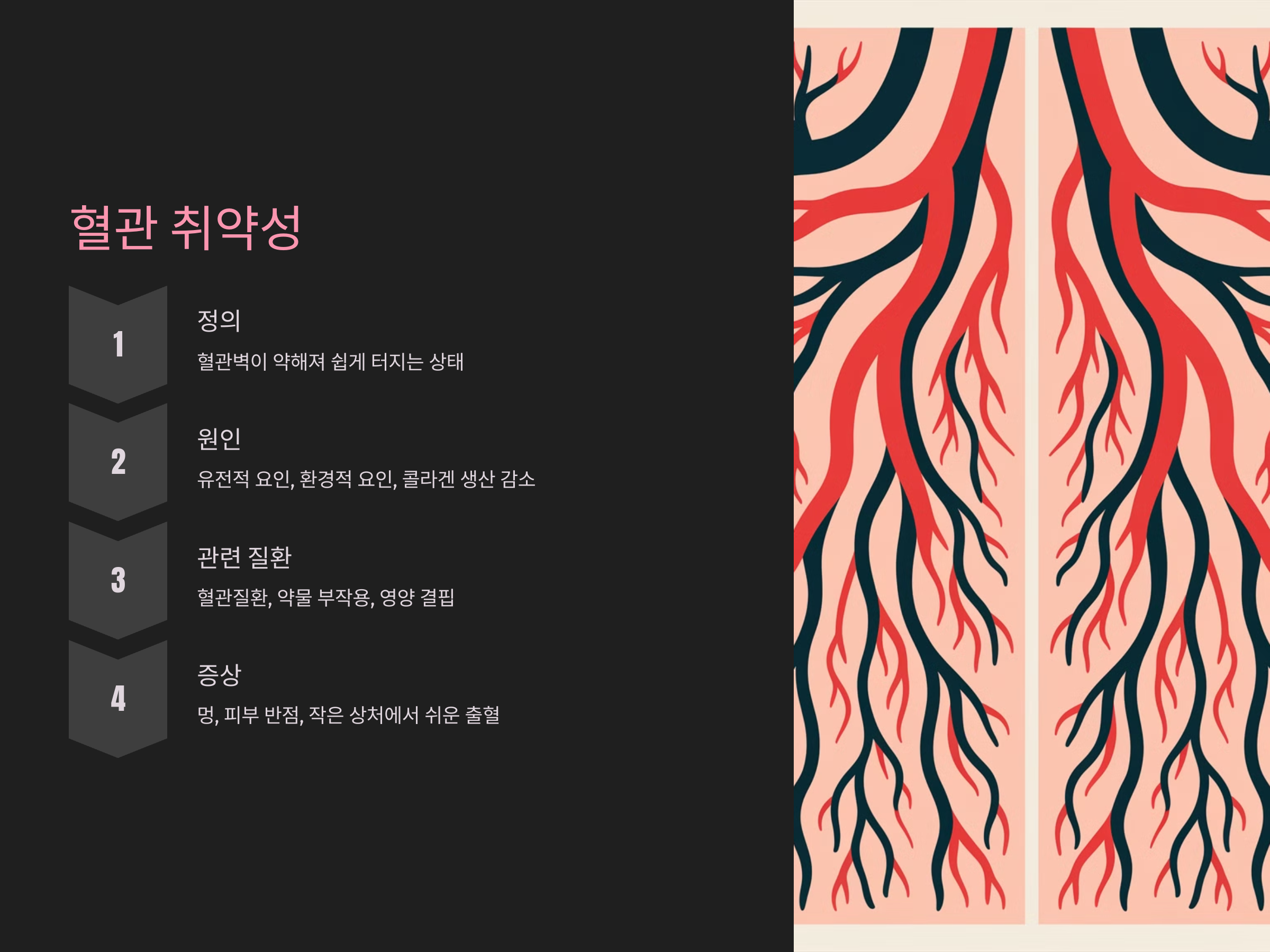 혈관 취약성은 혈관벽이 약해져 쉽게 터질 수 있는 상태를 말합니다. 이로 인해 작은 충격에도 혈관이 파열되거나 출혈이 발생할 수 있습니다. 혈관의 벽이 약해지면 작은 혈관들이 쉽게 손상되어 멍이 쉽게 드는 원인이 될 수 있습니다. 혈관 취약성은 주로 유전적 요인과 환경적 요인에 의해 영향을 받습니다. 특히, 콜라겐의 생산이 감소하거나 비정상적인 콜라겐 구조로 혈관이 취약해지는 경우가 많습니다.