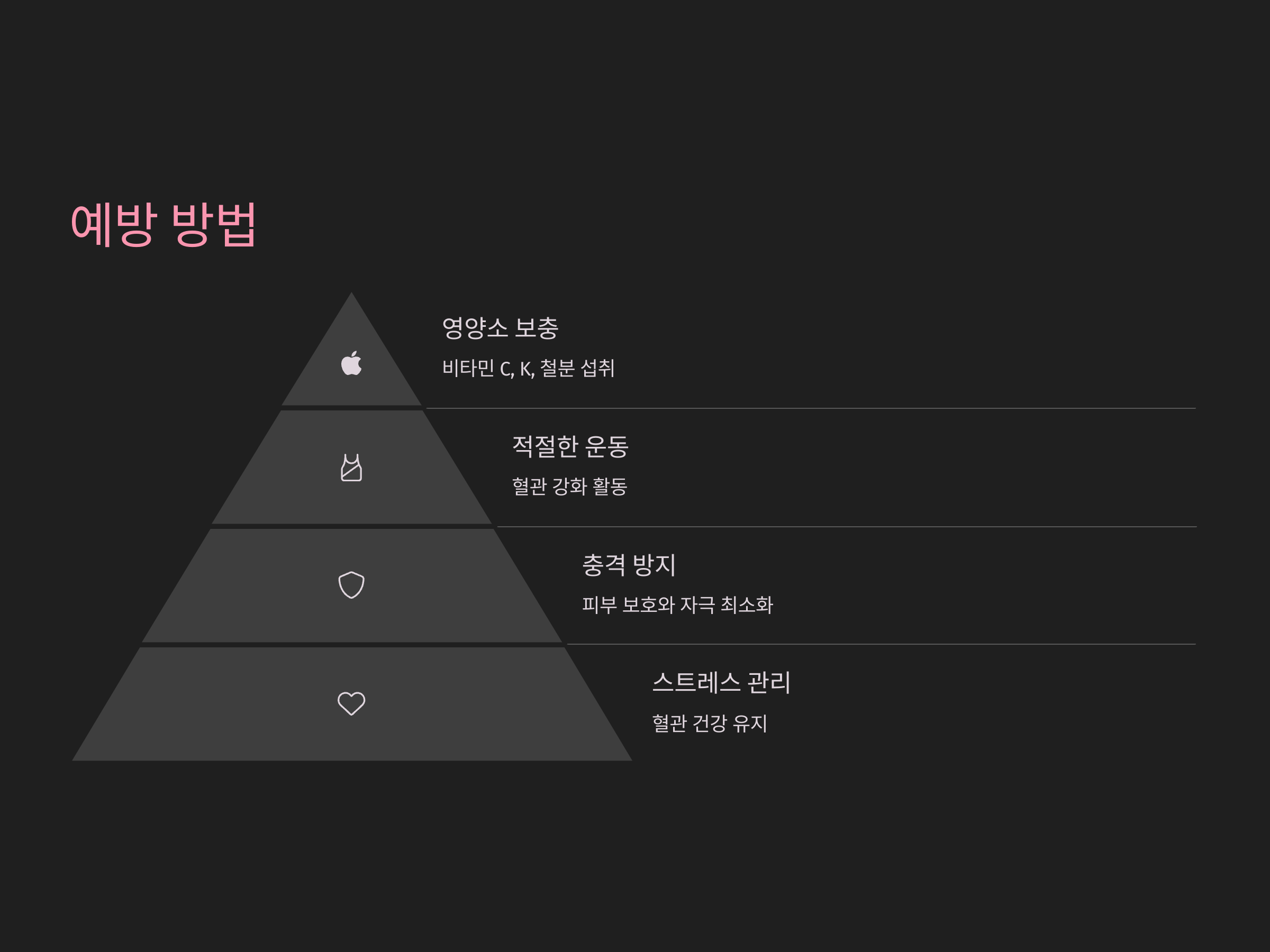 혈관 취약성을 예방하려면, 영양 보충과 규칙적인 운동, 스트레스 관리가 중요합니다. 또한, 비타민 C와 K 등의 영양소를 충분히 섭취하는 것이 도움이 됩니다.