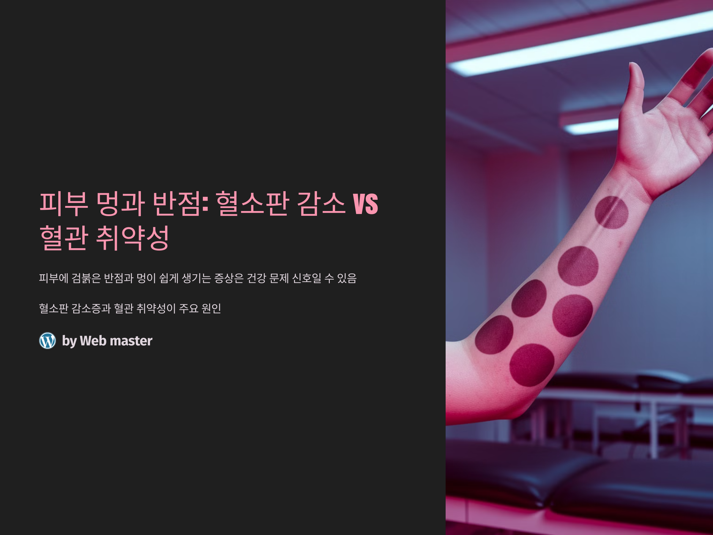 피부에 검붉은 반점이 생기고 멍이 쉽게 드는 증상은 일상적인 사고나 부딪힘이 원인일 수도 있지만, 종종 건강상 문제로 이어질 수 있습니다. 이러한 증상의 주요 원인으로 혈소판 감소증과 혈관 취약성이 있습니다. 이 두 가지 조건은 외형적으로 비슷한 증상을 나타낼 수 있으나, 그 원인과 치료법은 완전히 다릅니다. 오늘은 이 두 가지 상태를 비교하여 정확한 진단과 올바른 대처 방법을 알아보겠습니다.