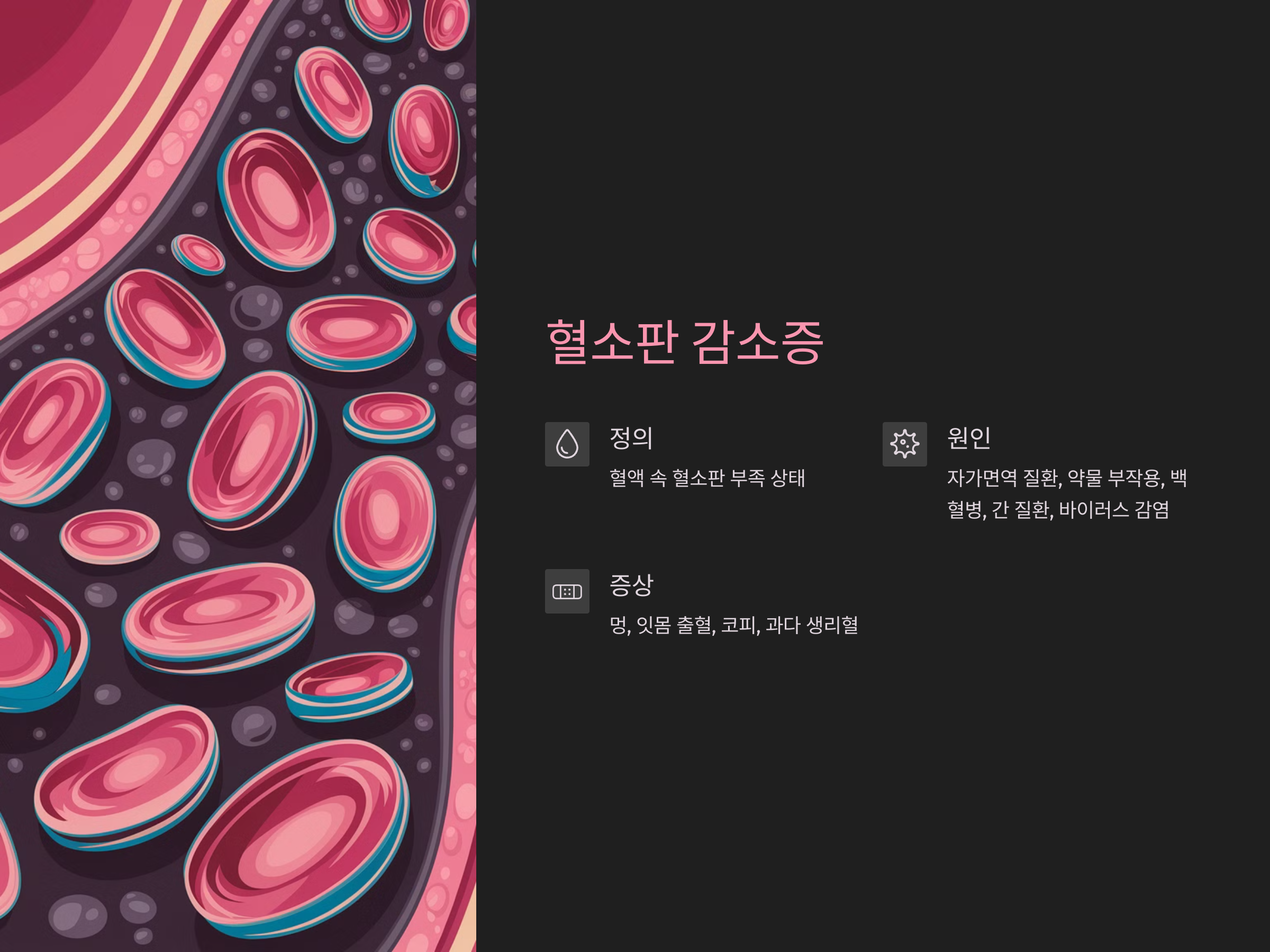 혈소판 감소증은 혈액 속에서 혈소판이 부족한 상태를 말합니다. 혈소판은 혈액 응고에 중요한 역할을 하는 세포로, 외부에서 상처를 입거나 손상이 생기면 이를 멈추게 하는 데 중요한 역할을 합니다. 혈소판의 수가 감소하면, 상처가 났을 때 출혈이 멈추는 속도가 느려지거나, 피부 아래에서 작은 출혈이 발생해 멍이 쉽게 드는 등의 증상이 나타날 수 있습니다.