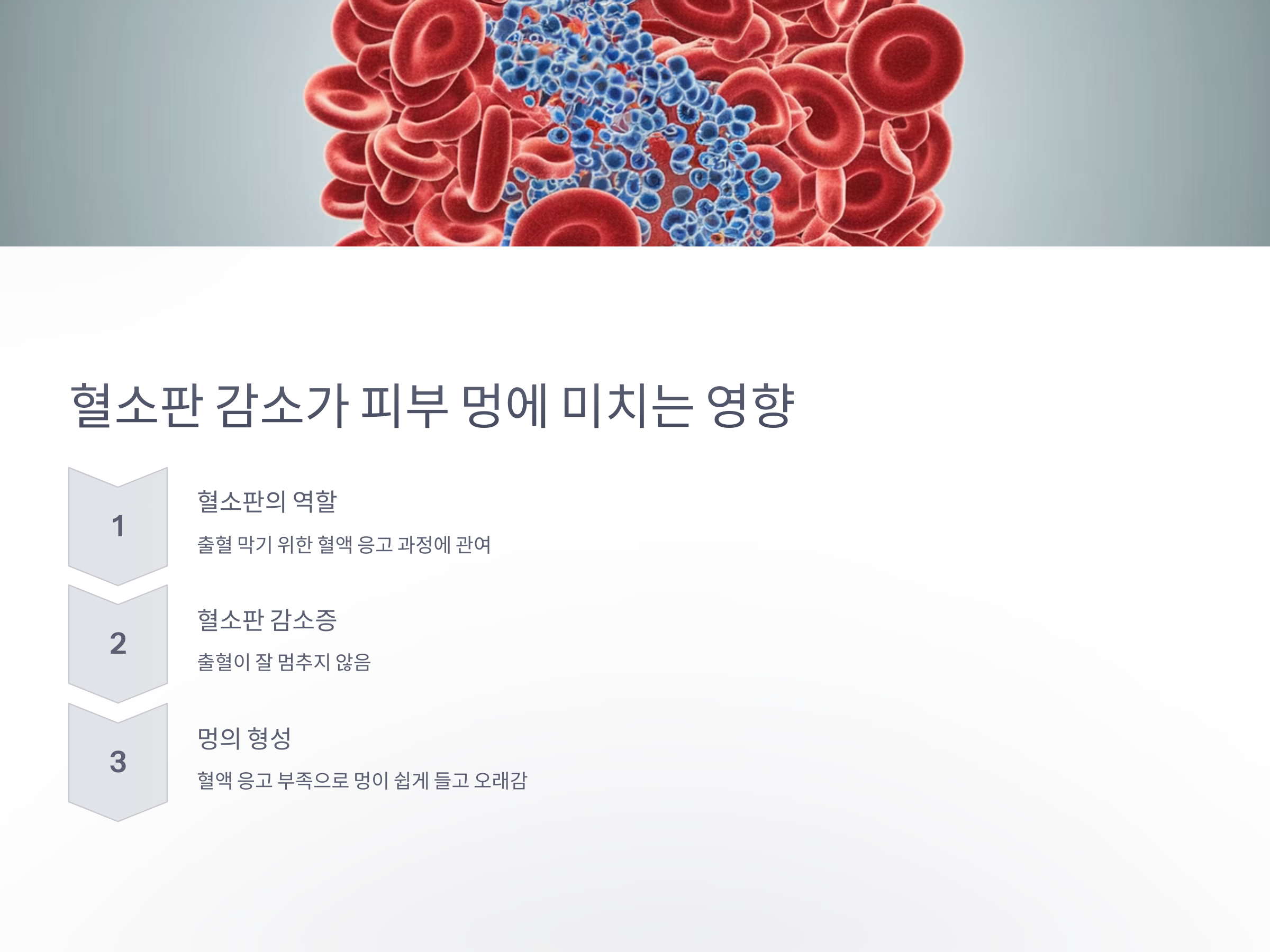 혈소판은 혈액 내에서 중요한 역할을 하는 세포로, 출혈을 막기 위해 혈액이 응고되는 과정에 관여합니다. 혈소판의 수가 정상보다 낮은 혈소판 감소증이 있을 경우, 출혈이 잘 멈추지 않거나 피부에 멍이 쉽게 생깁니다. 멍은 혈관이 터져 혈액이 주변 조직에 스며들면서 발생하는데, 이때 혈소판이 부족하면 혈액 응고가 제대로 이루어지지 않아 멍이 더 쉽게 들고, 그 지속 시간도 길어지게 됩니다.