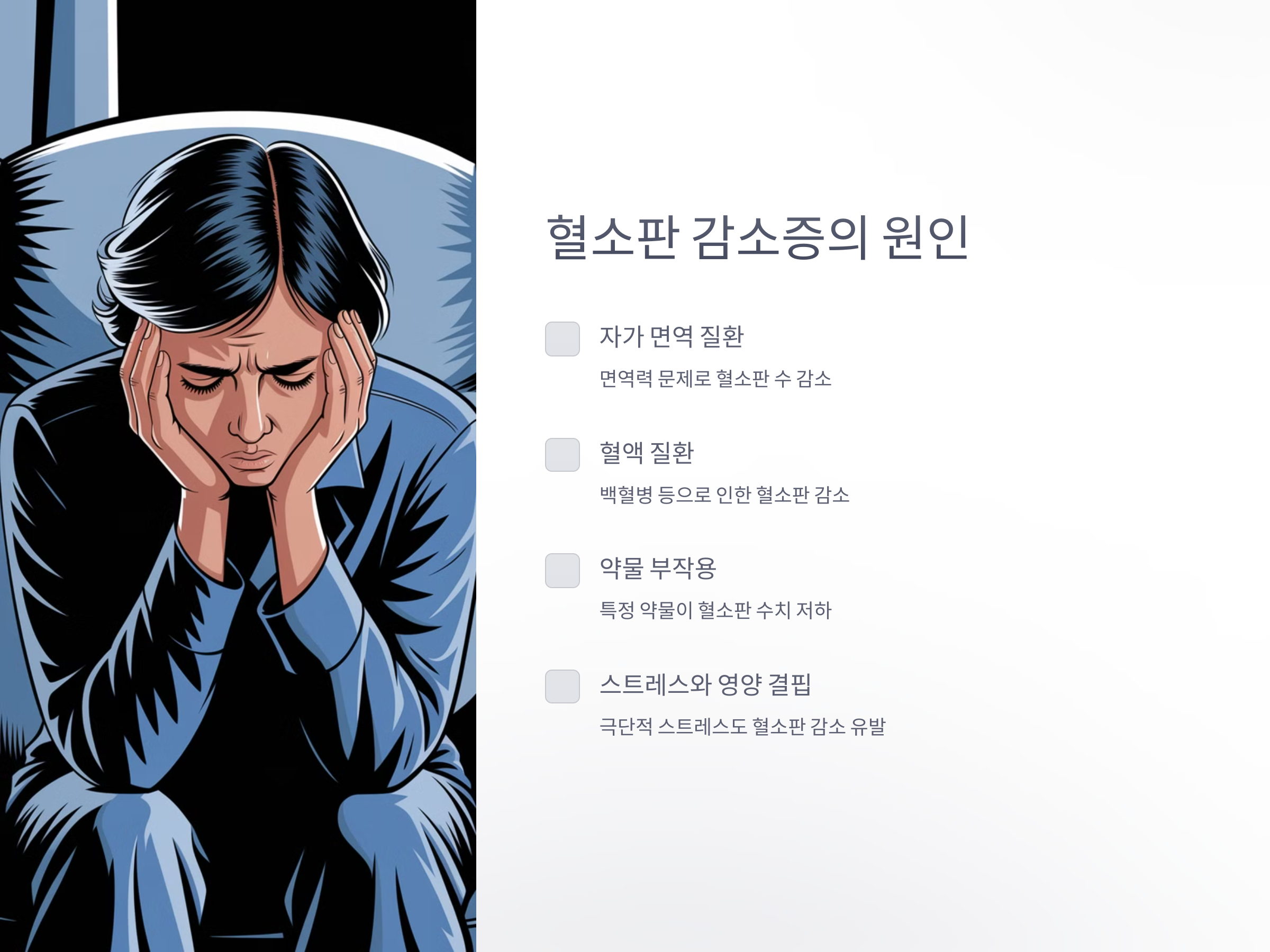 혈소판 감소증은 여러 원인으로 발생할 수 있습니다. 예를 들어, 면역력 문제로 인한 자가 면역 질환, 특정 약물의 부작용, 백혈병 등의 혈액 질환, 간질환 등 다양한 질병들이 혈소판 수를 감소시킬 수 있습니다. 이 외에도 극단적인 스트레스나 영양 결핍도 혈소판 감소를 일으킬 수 있습니다.