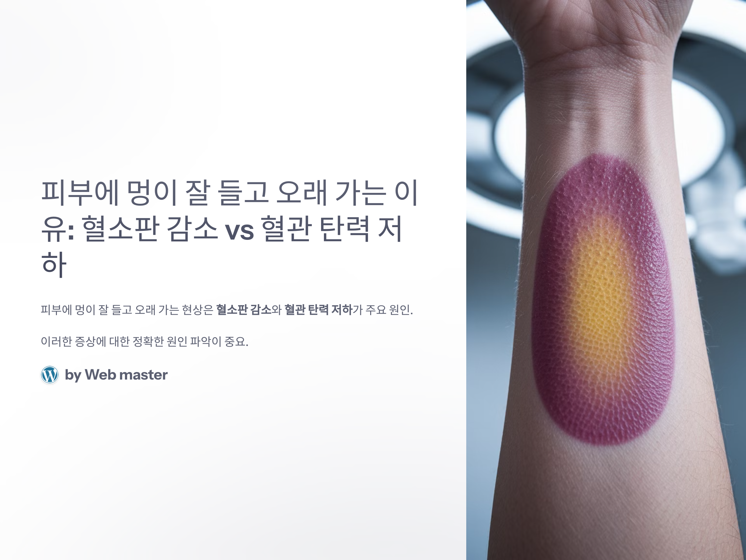 피부에 멍이 잘 들고 오래 가는 원인에는 혈소판 감소와 혈관 탄력 저하가 있습니다. 두 가지 모두 멍을 유발하지만, 그 원인과 치료 방법이 다르기 때문에 정확한 진단이 중요합니다. 혈소판 감소증이 의심된다면 혈액 검사를 통해 확인하고, 혈관 탄력 저하가 원인이라면 생활 습관을 개선하는 것이 가장 좋은 방법입니다.