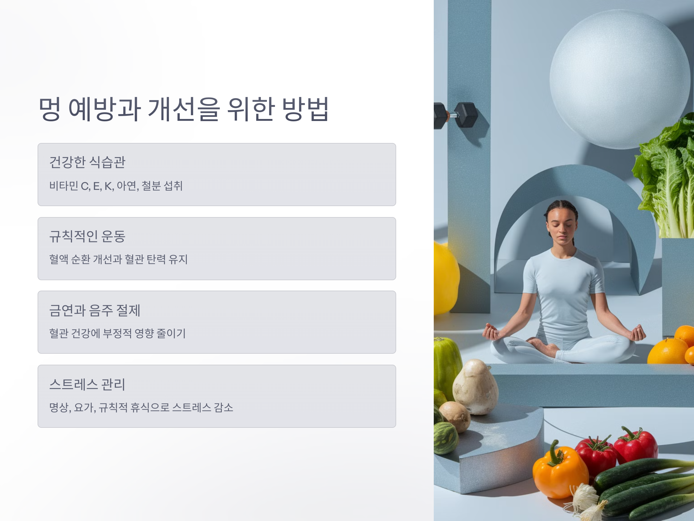 이제 멍이 자주 들고 오래 가는 원인에 대해 알았으니, 이를 예방하고 개선하기 위한 방법을 알아보겠습니다. 혈소판 감소나 혈관 탄력 저하와 같은 상태를 예방하기 위해서는 생활 습관을 개선하는 것이 중요합니다.