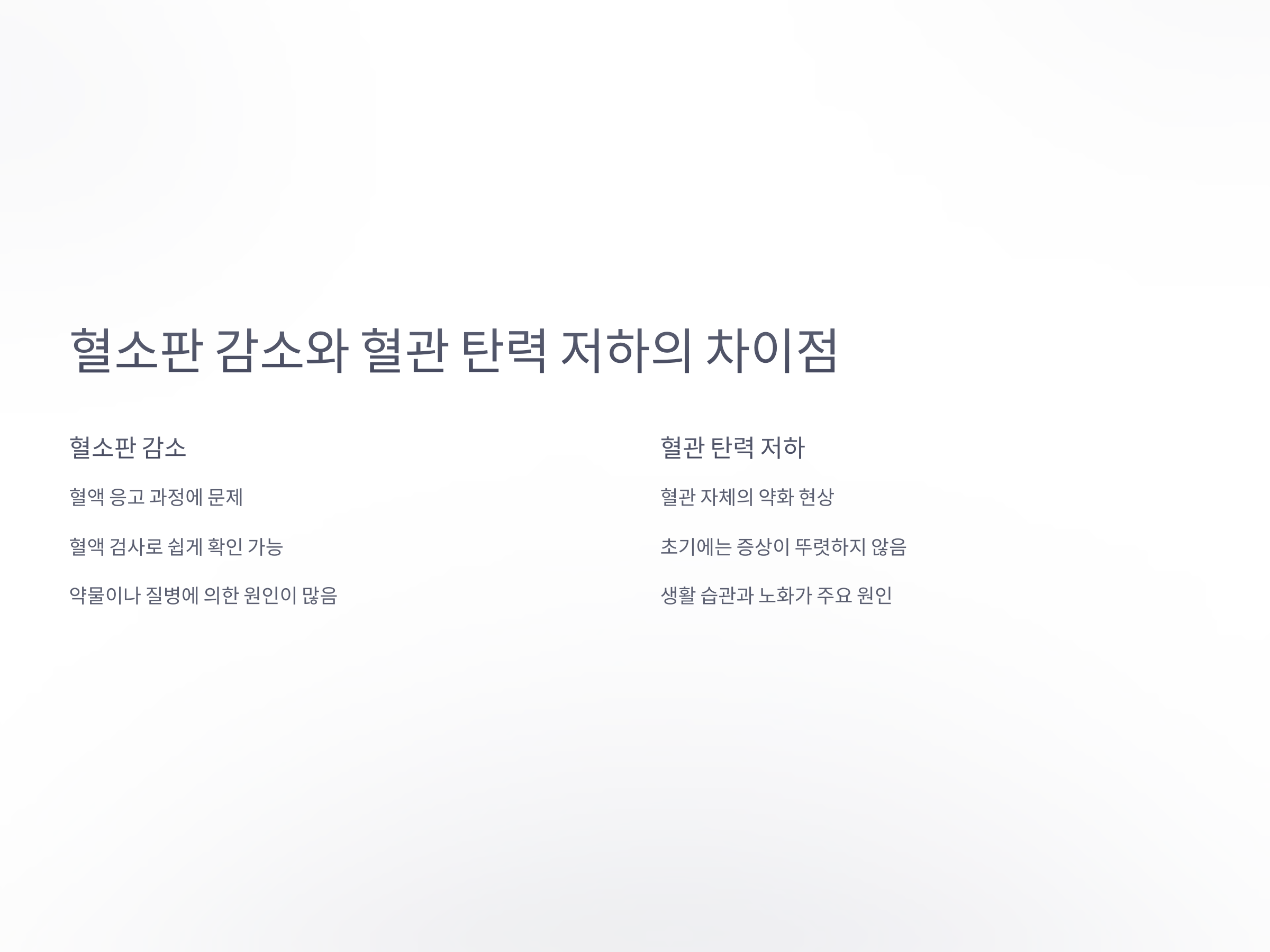 또한, 혈소판 감소는 혈액 검사를 통해 쉽게 확인할 수 있지만, 혈관 탄력 저하는 주로 생활 습관에 의한 변화가 크기 때문에 초기에는 별다른 증상이 나타나지 않기도 합니다. 그러나 시간이 지나면서 혈관이 약해지고, 멍이 자주 들며, 회복 속도가 늦어지는 현상이 나타날 수 있습니다.