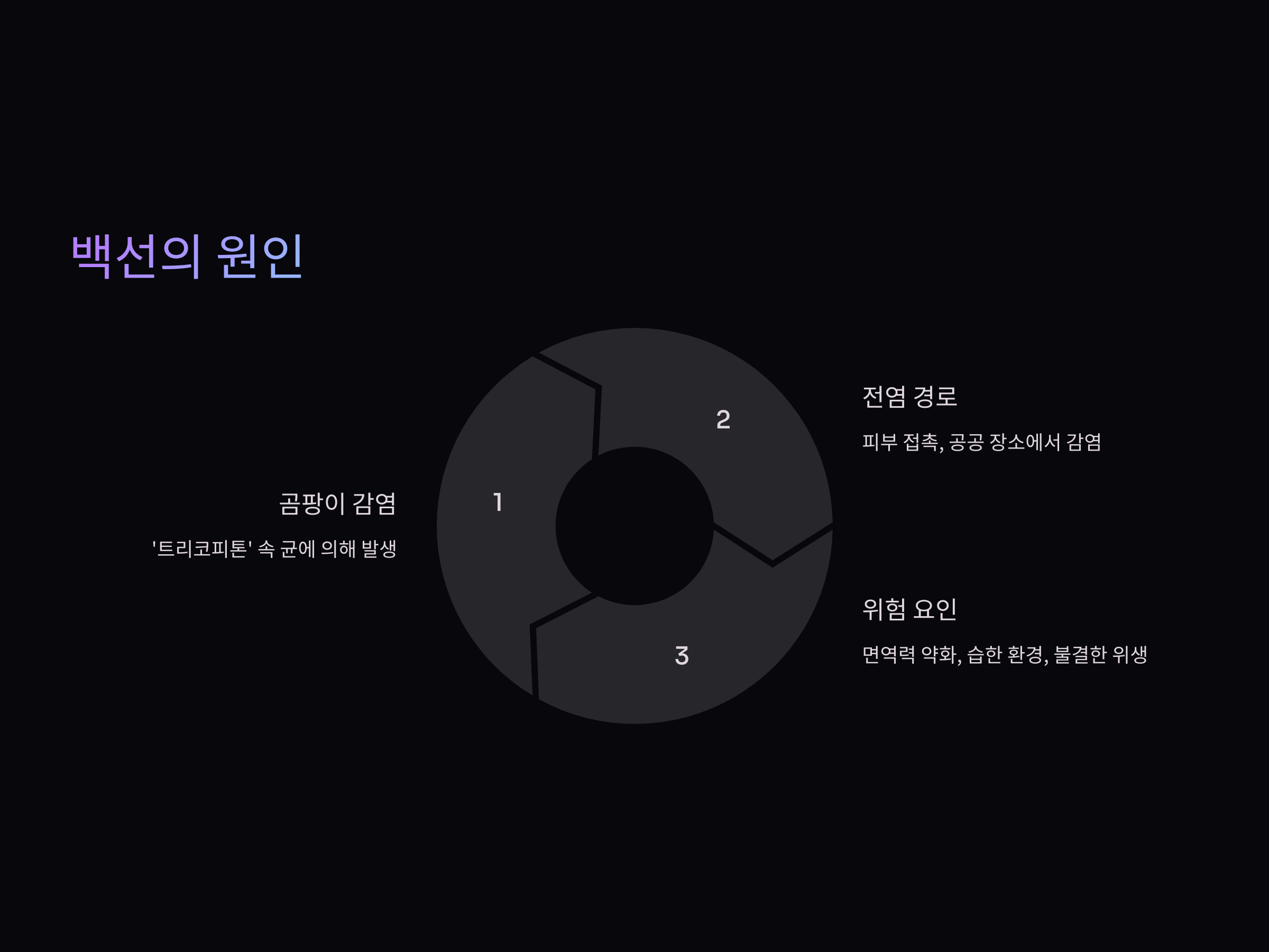 백선은 주로 곰팡이인 '트리코피톤' 속 균에 의해 발생합니다. 이 곰팡이는 피부, 손톱, 머리카락 등에 서식하며, 습기가 많고 따뜻한 환경에서 잘 자라납니다. 주로 피부 접촉을 통해 전염되며, 감염된 사람과의 신체 접촉이 주요한 감염 경로입니다. 또한, 공동 샤워실이나 공공 수영장처럼 습기가 많은 장소에서도 전염될 수 있습니다.