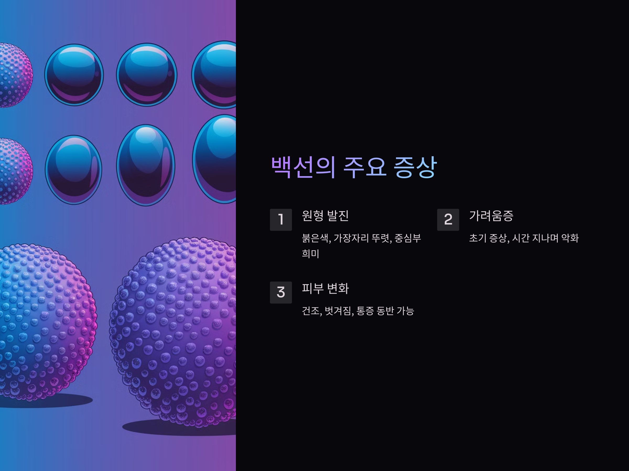 피부에 동그란 발진이 나타났다면, 그 원인 중 하나는 백선일 수 있습니다. 백선은 피부에 발생하는 곰팡이 감염으로, 표면에 원형 발진이나 가려움증을 유발합니다. 이 문제를 간과하면 증상이 악화될 수 있기 때문에, 빠르게 대응하는 것이 중요합니다. 이 글에서는 백선의 증상, 원인, 치료법을 자세히 알아보겠습니다. 이를 통해 어떻게 예방하고 관리할 수 있는지 구체적인 방법도 함께 소개합니다.