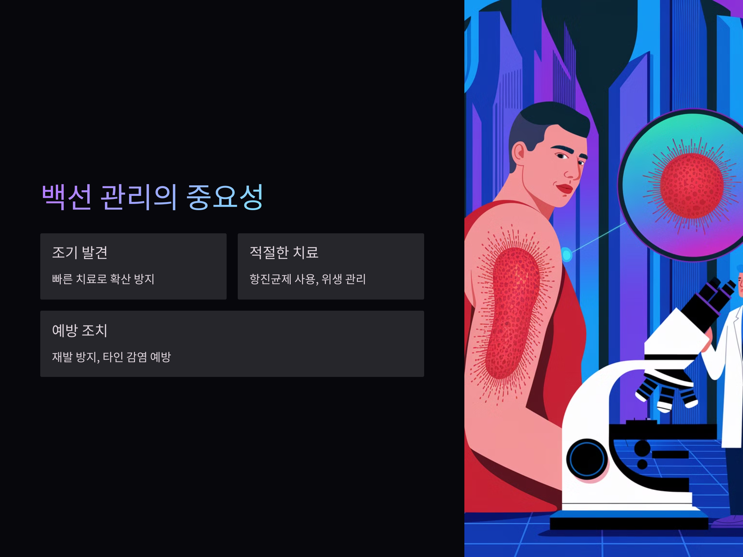피부 백선은 전염성이 강하고 빠르게 퍼질 수 있기 때문에, 조기에 발견하고 적절한 치료를 받는 것이 중요합니다. 백선의 주요 증상인 원형 발진을 발견하면 즉시 치료를 시작하고, 위생 관리와 예방 조치를 철저히 하여 재발을 방지하는 것이 최선입니다. 또한, 다른 사람과의 접촉을 피하고 감염된 부위를 청결하게 유지하여 확산을 막는 것도 중요합니다.