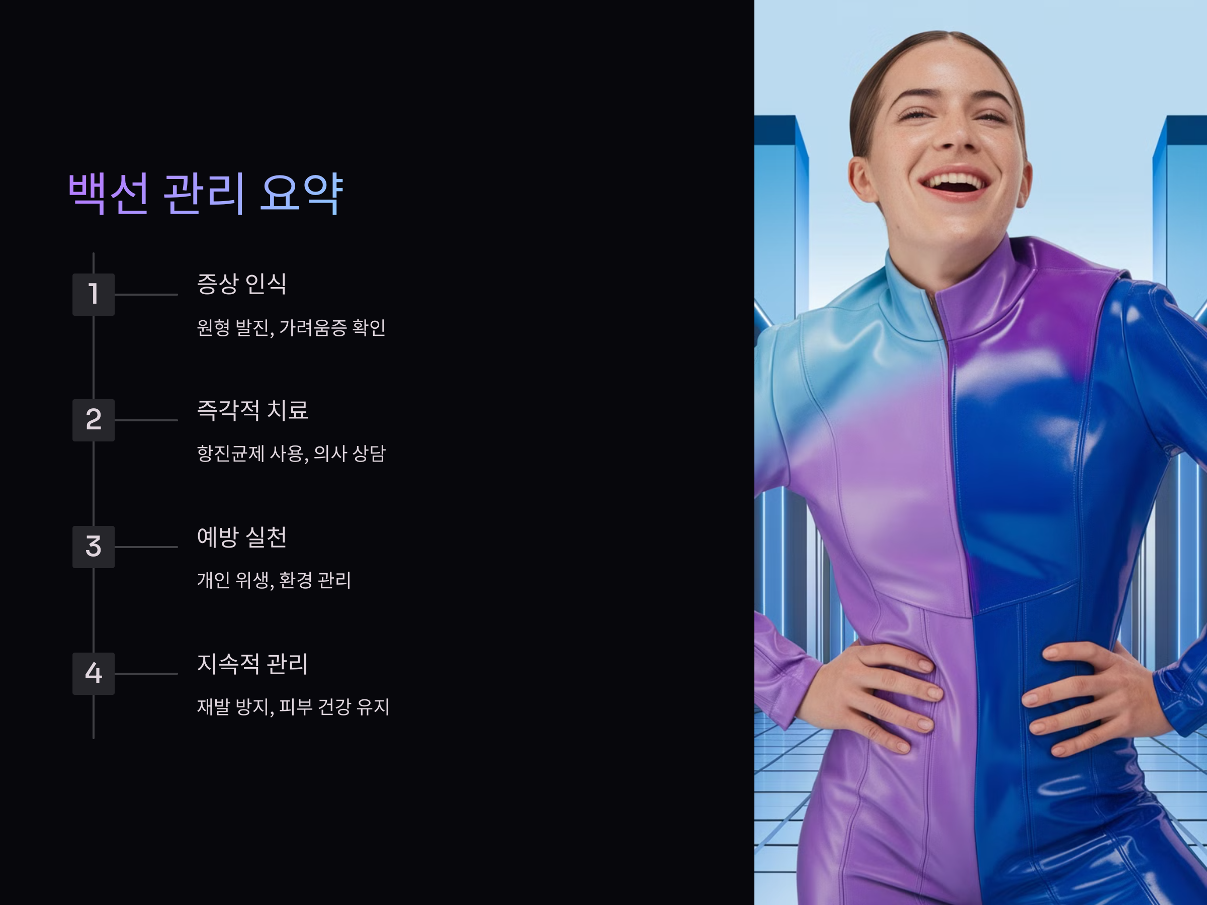 피부 백선은 관리와 치료를 제대로 받으면 충분히 회복할 수 있는 질환입니다. 빠른 치료와 함께, 꾸준한 예방과 관리가 필요합니다. 백선을 예방하려면 항상 개인 위생을 철저히 하고, 감염된 사람과의 접촉을 피하며, 공공 장소에서의 주의를 기울여야 합니다. 증상이 나타나면 즉시 치료를 시작하고, 재발을 방지하기 위해 치료 후 관리에도 신경을 써야 합니다.