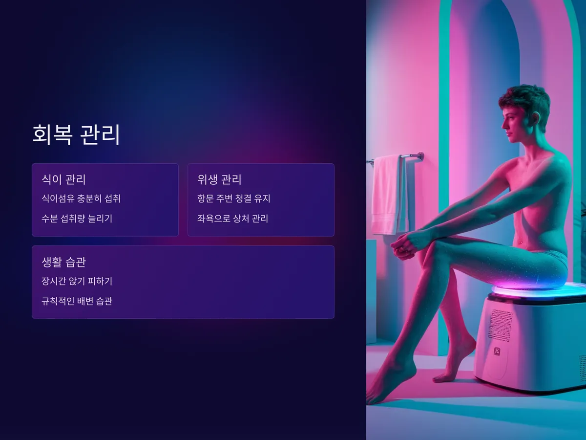 또한 극단적인 다이어트로 인해 장 건강이 악화된 경우에도 항문 농양 위험이 증가합니다. 특히 식이섬유 섭취가 부족하거나 물을 적게 마시는 경우 배변 시 잔변감과 함께 항문 조직에 미세 손상이 발생할 수 있고, 이 틈을 타 박테리아가 감염되기 쉽습니다. 여름철 땀이 많이 나는 계절에도 항문 주변이 습하게 유지되면서 세균 증식 환경이 조성되기 때문에 계절성 발병 경향도 일부 존재합니