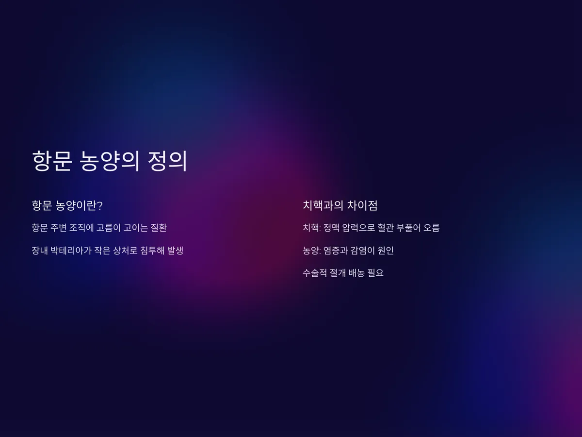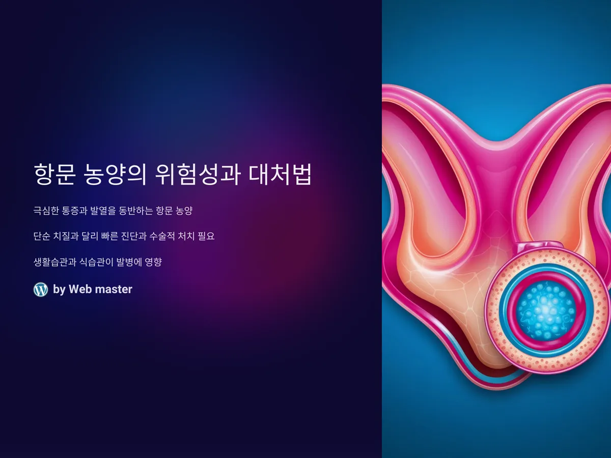 최근에는 앉아있는 시간이 긴 재택근무자, 장시간 운전기사, 또는 무리한 다이어트를 진행하는 젊은 층에게서도 자주 발견되고 있어 생활습관과 식습관의 중요성도 재조명되고 있습니다. 특히 '직장 내시경'과 '초음파 진단'을 통해 빠른 감별이 가능해졌고, 항생제 투여 전 수술적 배농이 필수로 간주되고 있습니다. 본 포스팅에서는 항문 농양의 원인과 주요 증상, 진단법과 치료법은 물론이고, 회복을 위한 생활 관리 방법까지 깊이 있게 다루어봅니다. 극심한 통증과 발열로 고통받는 분들이 놓쳐서는 안 될 중요한 정보들을 확인해보세요.