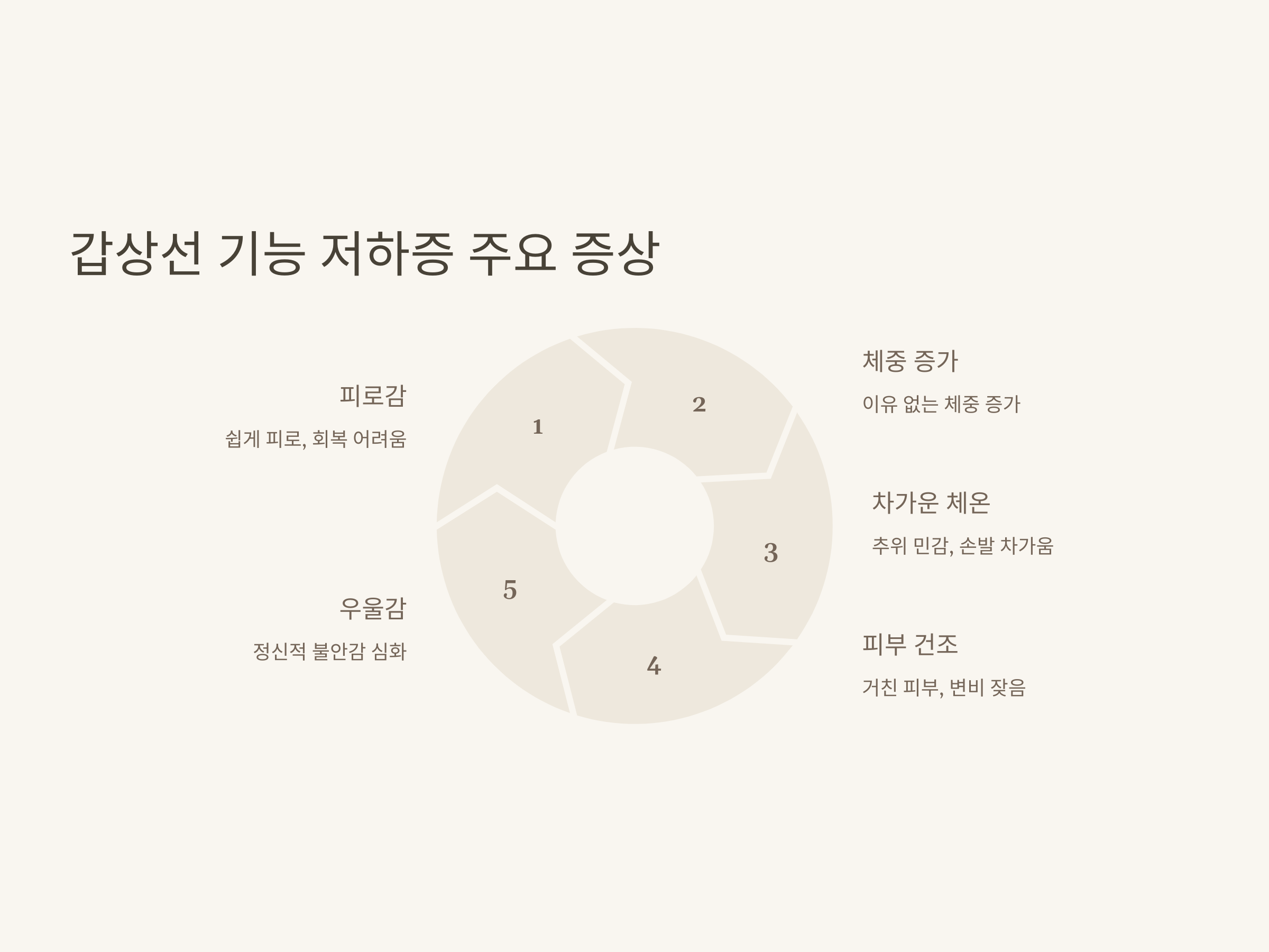 주요 증상으로는 피로감, 체중 증가, 추위 민감성, 건조한 피부, 변비, 우울감 등이 있습니다. 특히 갑상선 호르몬이 부족하면 신체 전반적인 기능이 저하되며, 일상적인 활동에도 큰 영향을 미칩니다. 또한, 호르몬 불균형으로 인해 신경계와 심혈관계에 문제가 생길 수도 있습니다.