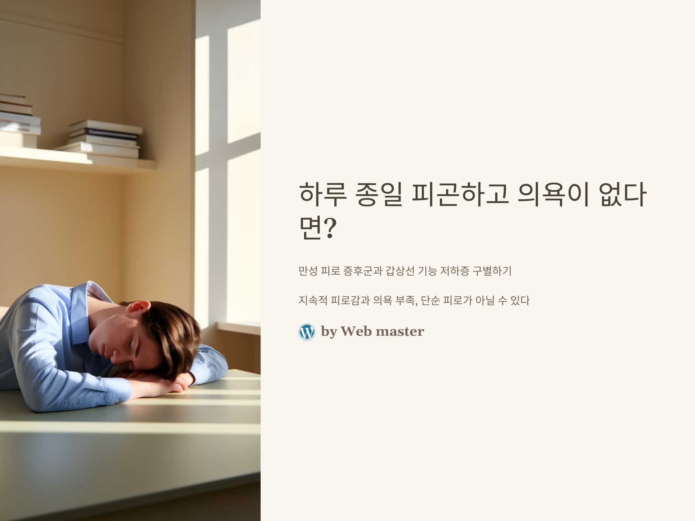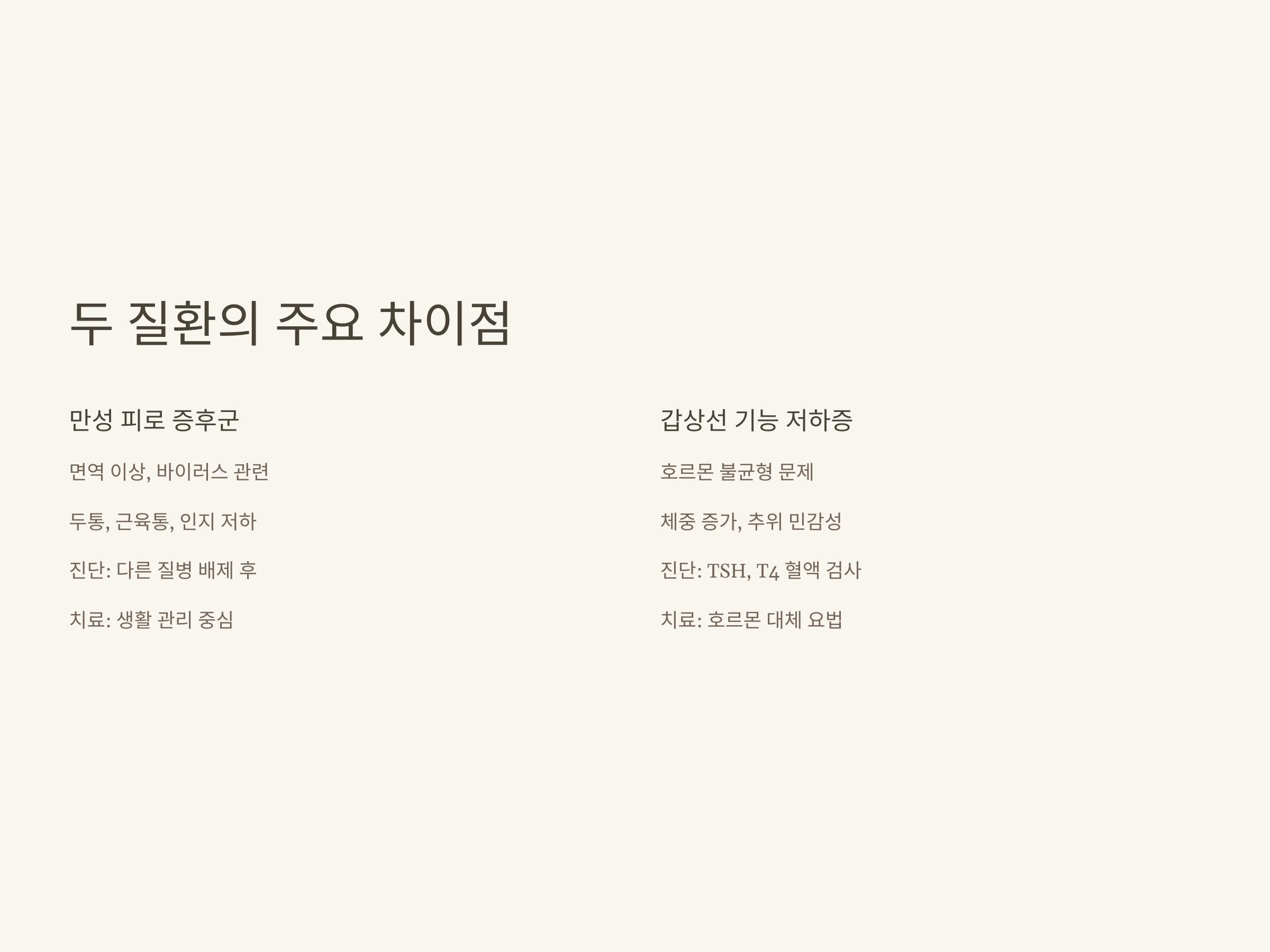 피로감이 심하고 의욕이 없을 때, 그 이유를 확실히 알아두면 적절한 치료를 받을 수 있고, 일상생활에서 더 나은 컨디션을 유지할 수 있습니다. 그렇다면 만성 피로 증후군과 갑상선 기능 저하는 어떻게 구별할 수 있을까요? 각 질환의 증상과 원인, 치료 방법을 하나씩 살펴보겠습니다.