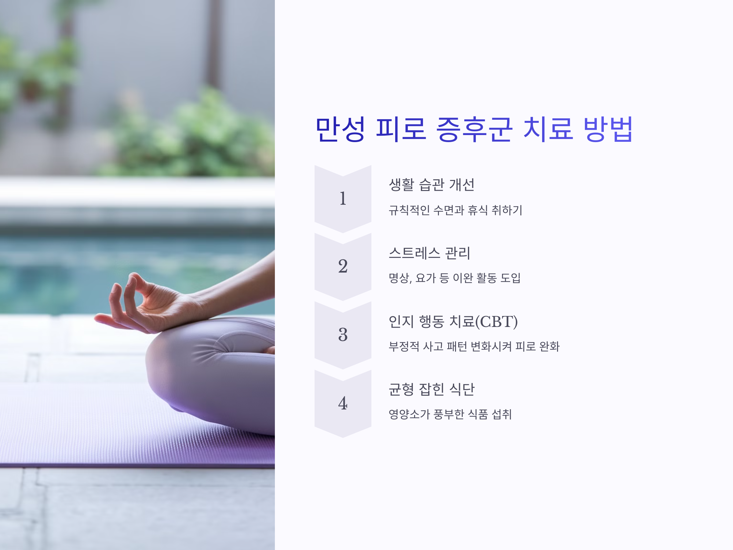 만성 피로 증후군의 치료는 원인에 따라 다르지만, 주로 생활 습관 개선, 스트레스 관리, 적절한 운동, 수면 개선 등이 포함됩니다. 일부 환자는 심리적인 원인도 있기 때문에, 심리 치료나 상담을 통해 정신적인 부담을 덜어주는 것이 필요할 수 있습니다.