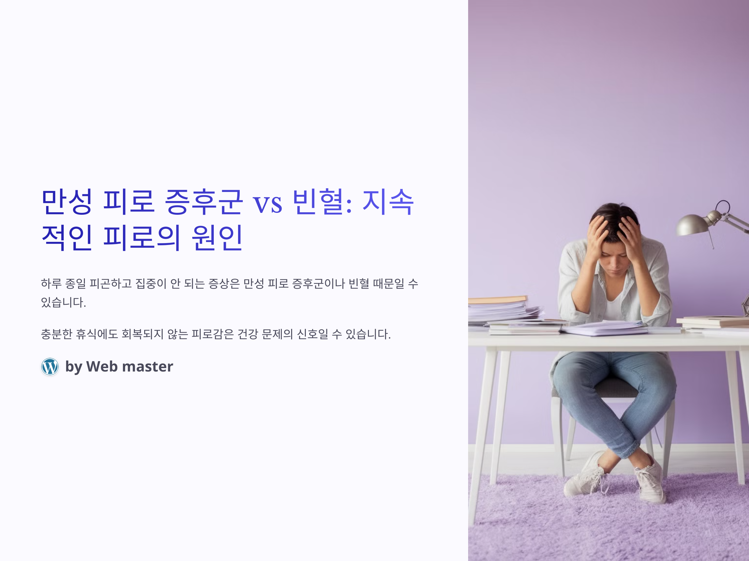 일상에서 갑작스럽게 피로감을 느끼거나, 아무리 잠을 자도 몸이 회복되지 않아서 피곤함을 느끼는 경우가 종종 있습니다. 특히 이러한 증상이 지속되면 "만성 피로 증후군"이나 "빈혈"과 같은 건강 문제를 의심하게 될 수 있습니다. 이 두 가지 모두 피로와 집중력 저하를 유발할 수 있지만, 그 원인과 증상은 다소 차이가 있습니다.