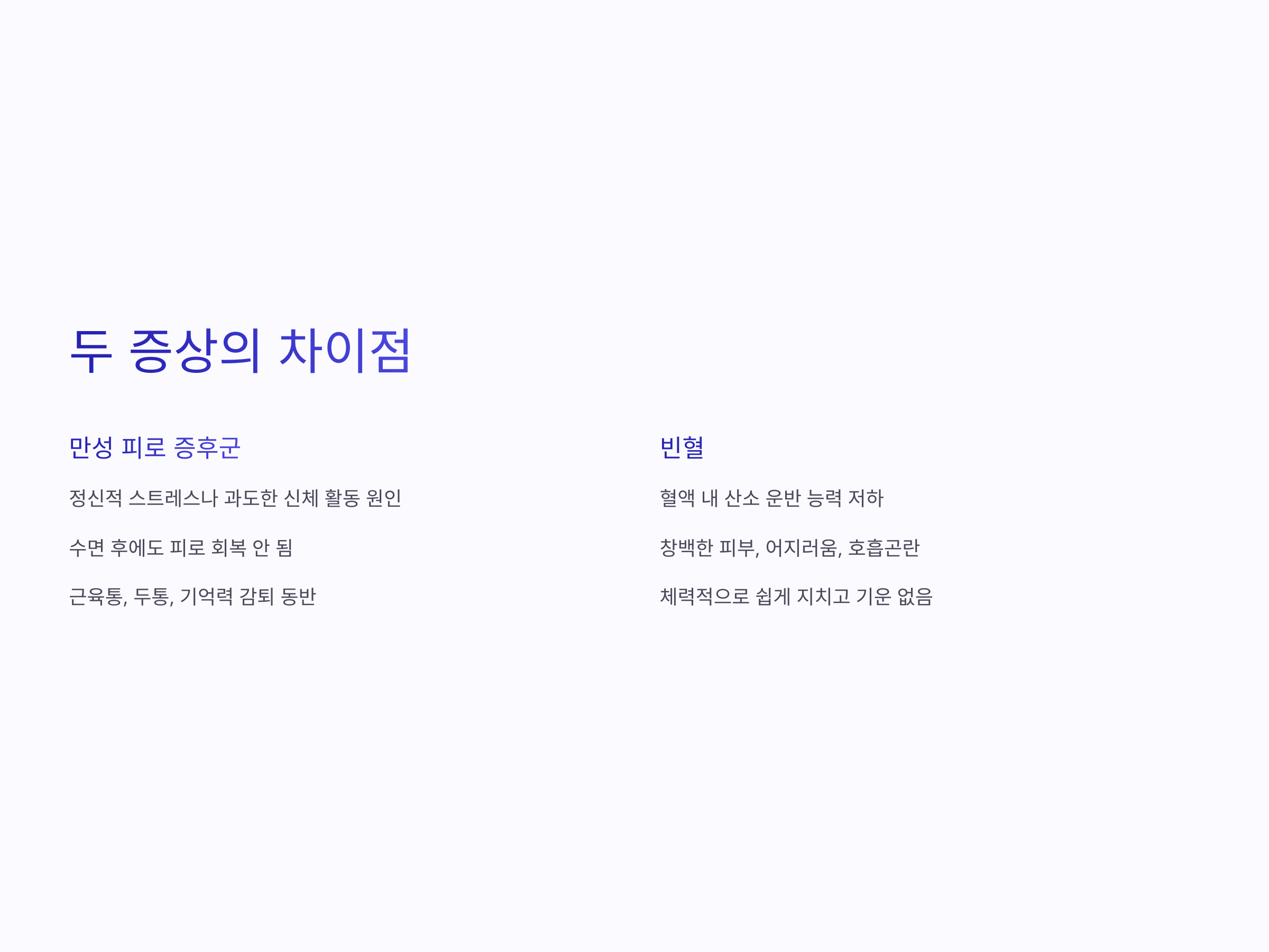 만성 피로 증후군과 빈혈 모두 피로감과 집중력 저하를 유발하지만, 두 가지의 차이점은 증상의 성격과 발생 원인에 있습니다. 만성 피로 증후군은 주로 신체적인 원인보다는 정신적 스트레스나 과도한 신체 활동으로 인한 피로 축적이 주요 원인입니다. 반면, 빈혈은 실제 혈액 내 산소를 운반하는 능력이 저하되어 나타나는 신체적인 문제입니다.