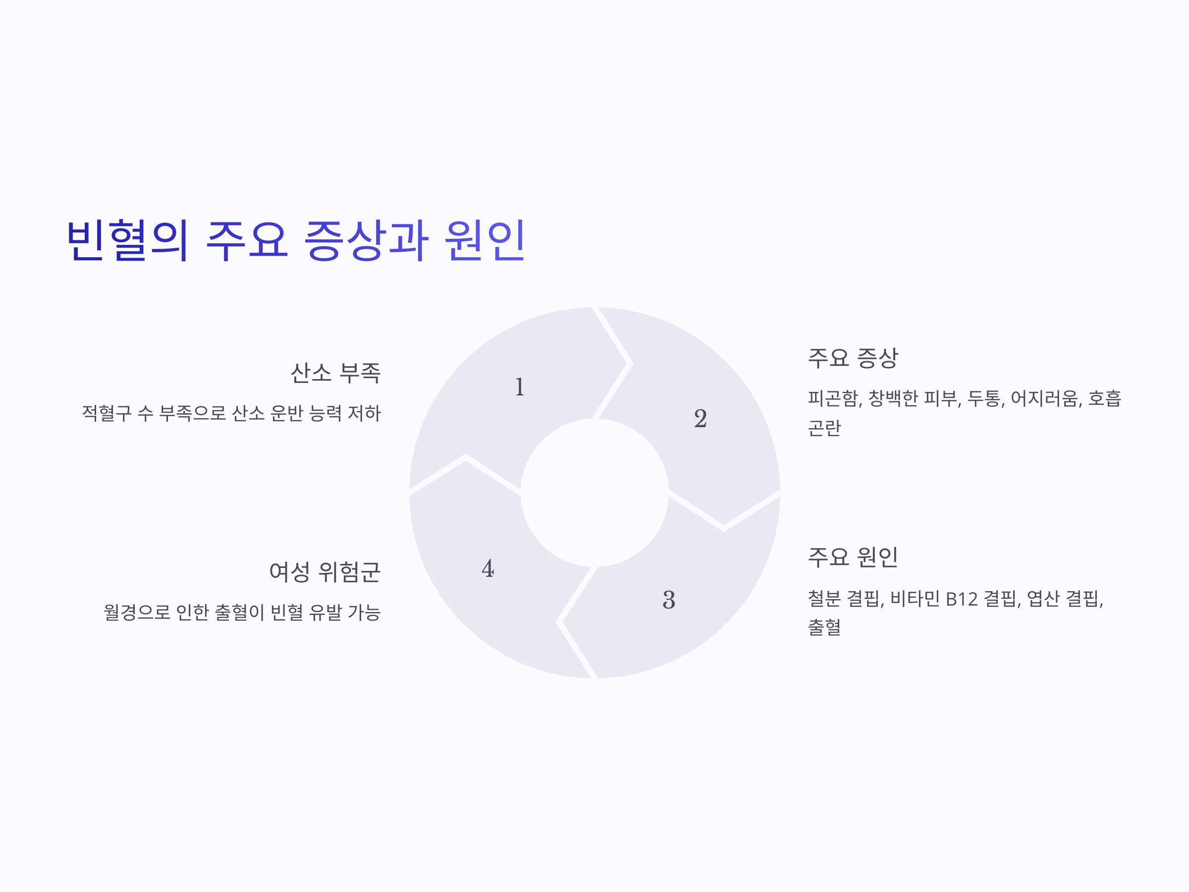 빈혈은 혈액 내 적혈구 수가 부족하거나, 적혈구가 산소를 충분히 운반할 수 없는 상태를 말합니다. 빈혈이 있을 경우, 몸은 충분한 산소를 공급받지 못하므로 지속적인 피로감을 느끼게 됩니다. 주요 증상으로는 피곤함, 집중력 저하, 창백한 피부, 두통, 어지러움, 호흡곤란 등이 있으며, 심한 경우에는 심장박동이 빨라지는 증상도 나타날 수 있습니다.