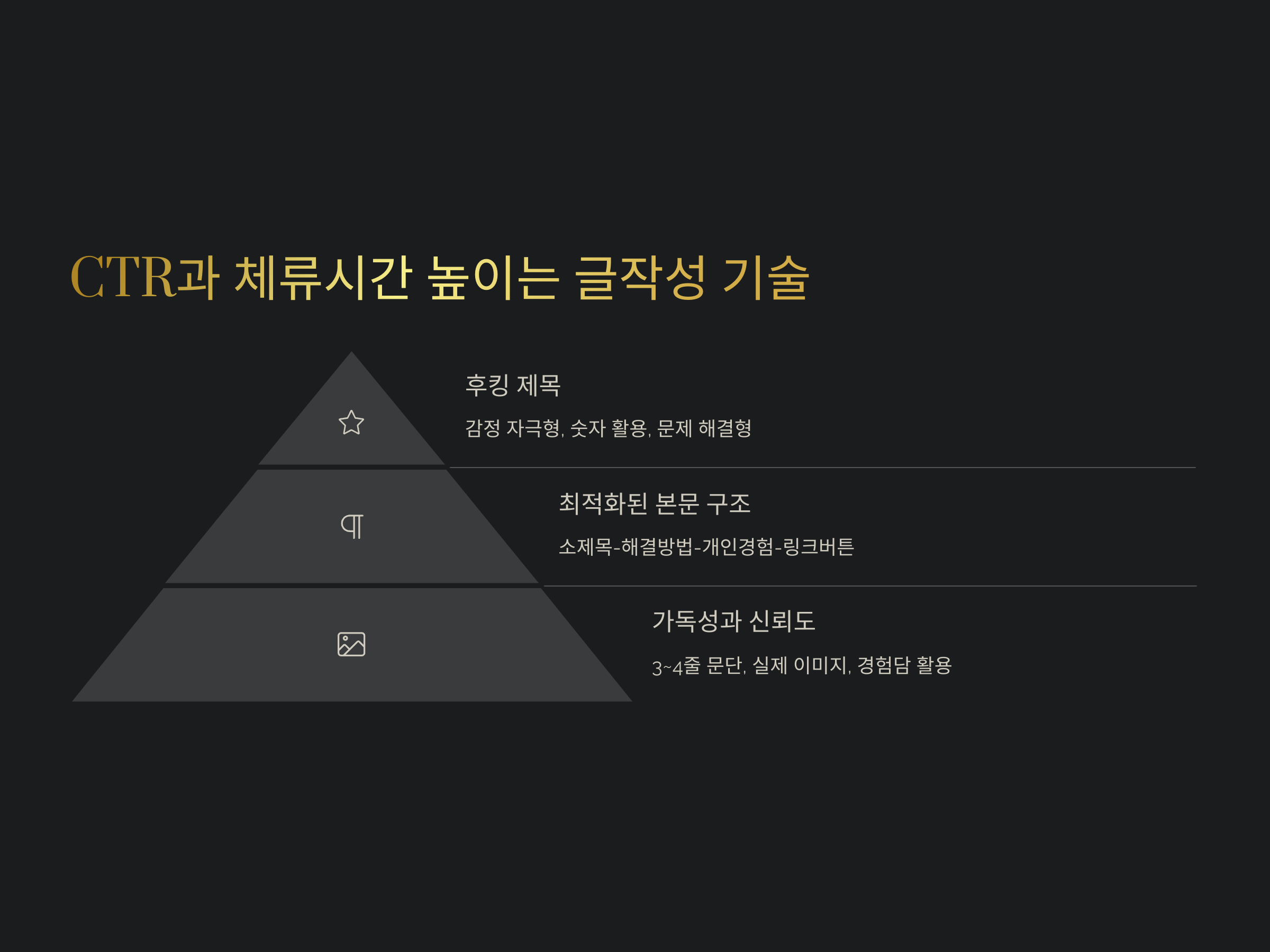 CTR을 높이기 위한 첫 전략은 '후킹 제목'입니다. 클릭을 유도할 수 있는 감정 자극형 제목이나 구체적인 숫자, 문제 해결형 표현이 매우 효과적이죠. 본문에서는 '소제목 - 해결방법 - 개인경험 - 링크버튼' 구성으로 리듬을 만들면 체류시간이 확 늘어납니다. 또한 문단당 3~4줄로 나눠 가독성을 높이고, 중간중간 실제 이미지나 경험담을 녹이면 신뢰도가 상승하면서 사용자 반응이 훨씬 좋아집니다.