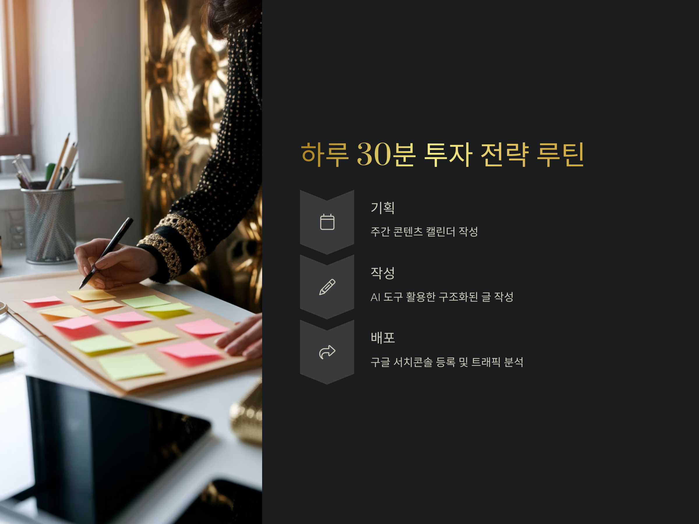 실제 블로그 자동수익을 낸 유저들이 공통적으로 실천하는 핵심 루틴은 '기획 - 작성 - 배포'의 3단계입니다. 1단계는 주간 콘텐츠 캘린더 작성으로, 키워드 분석을 통해 높은 검색량 대비 경쟁률이 낮은 주제를 선정합니다. 2단계는 AI 도구(GPT-4.5 등)를 활용한 마크다운 기반 포맷 글 작성이며, 이때 구조화된 중제목과 자연스러운 흐름이 중요합니다. 3단계는 배포 후 구글 서치콘솔 등록 및 트래픽 흐름 분석으로 이어지죠. 하루에 30분, 딱 이 루틴만 유지해도 수익이 조금씩 쌓이는 구조가 완성됩니다.