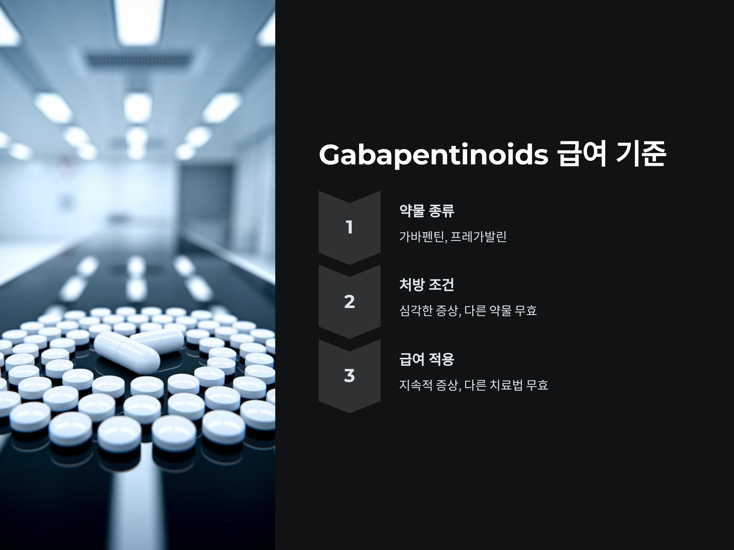 Gabapentinoids 계열 약물은 가바펜틴(Gabapentin)이나 프레가발린(Pregabalin) 등이 있습니다. 이들 약물은 증상이 심각할 때 또는 다른 약물로 효과를 보지 못한 경우에 처방됩니다. 건강보험 급여를 받기 위해서는 증상이 계속해서 지속되며 약물 치료 외에 다른 치료법이 효과가 없는 경우에만 급여 적용이 가능합니다.