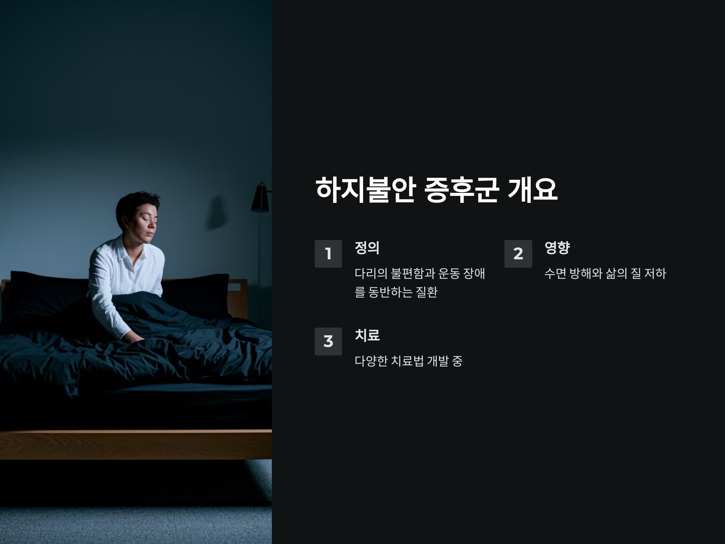 하지불안 증후군(RLS: Restless Legs Syndrome)은 다리의 불편한 느낌과 함께 자주 발생하는 운동 장애로, 수면에 방해를 주고 삶의 질을 떨어뜨리는 질환입니다. 최근에는 이 증후군에 대한 치료법이 다양해지고 있으며, 이에 대한 건강보험 급여 적용 여부와 철분 보충제의 보험 적용 여부에 대해서도 궁금해하는 분들이 많습니다. 오늘은 하지불안 증후군 치료제와 철분 보충제에 대한 건강보험 급여 기준을 알아보겠습니다.