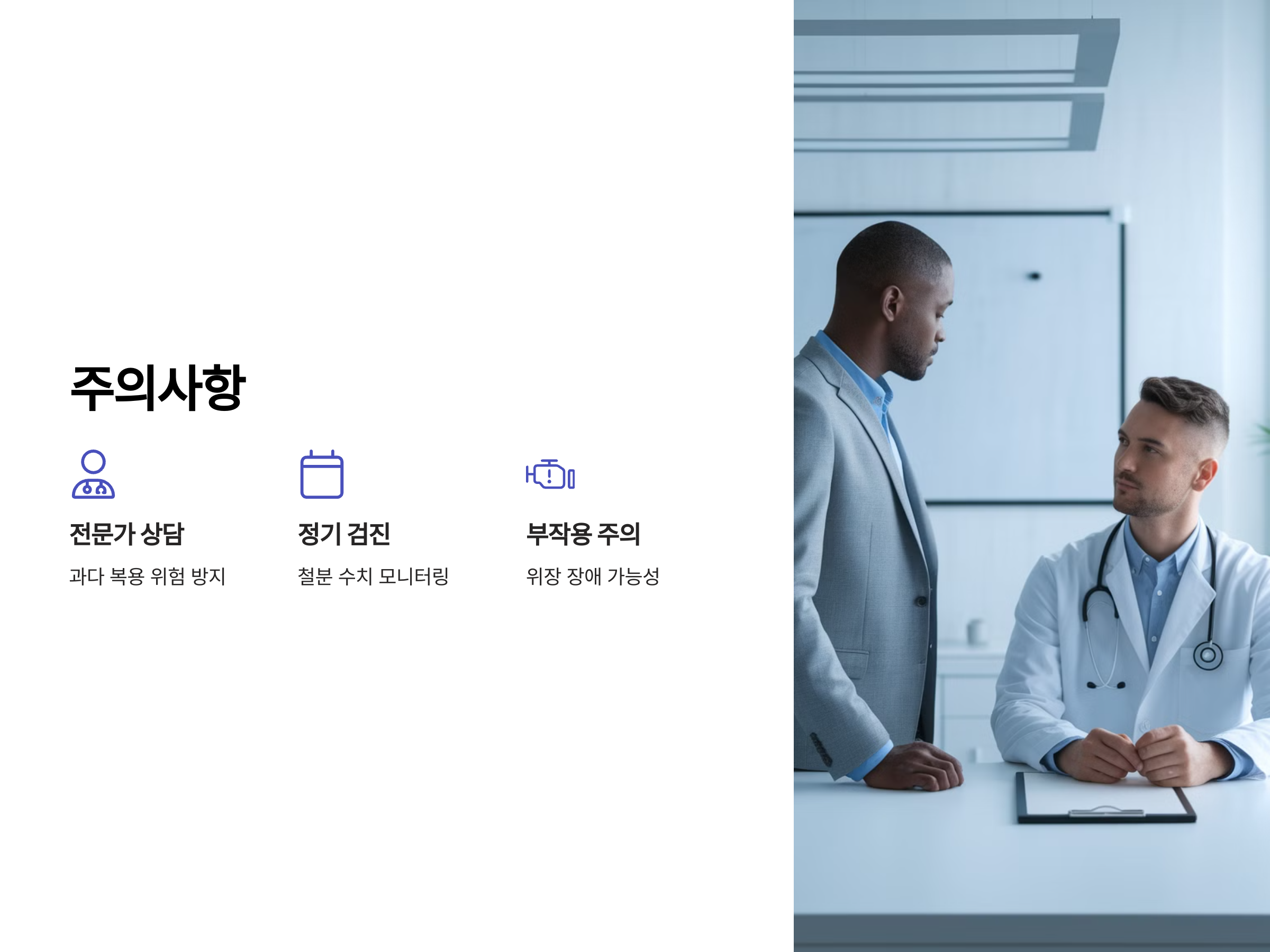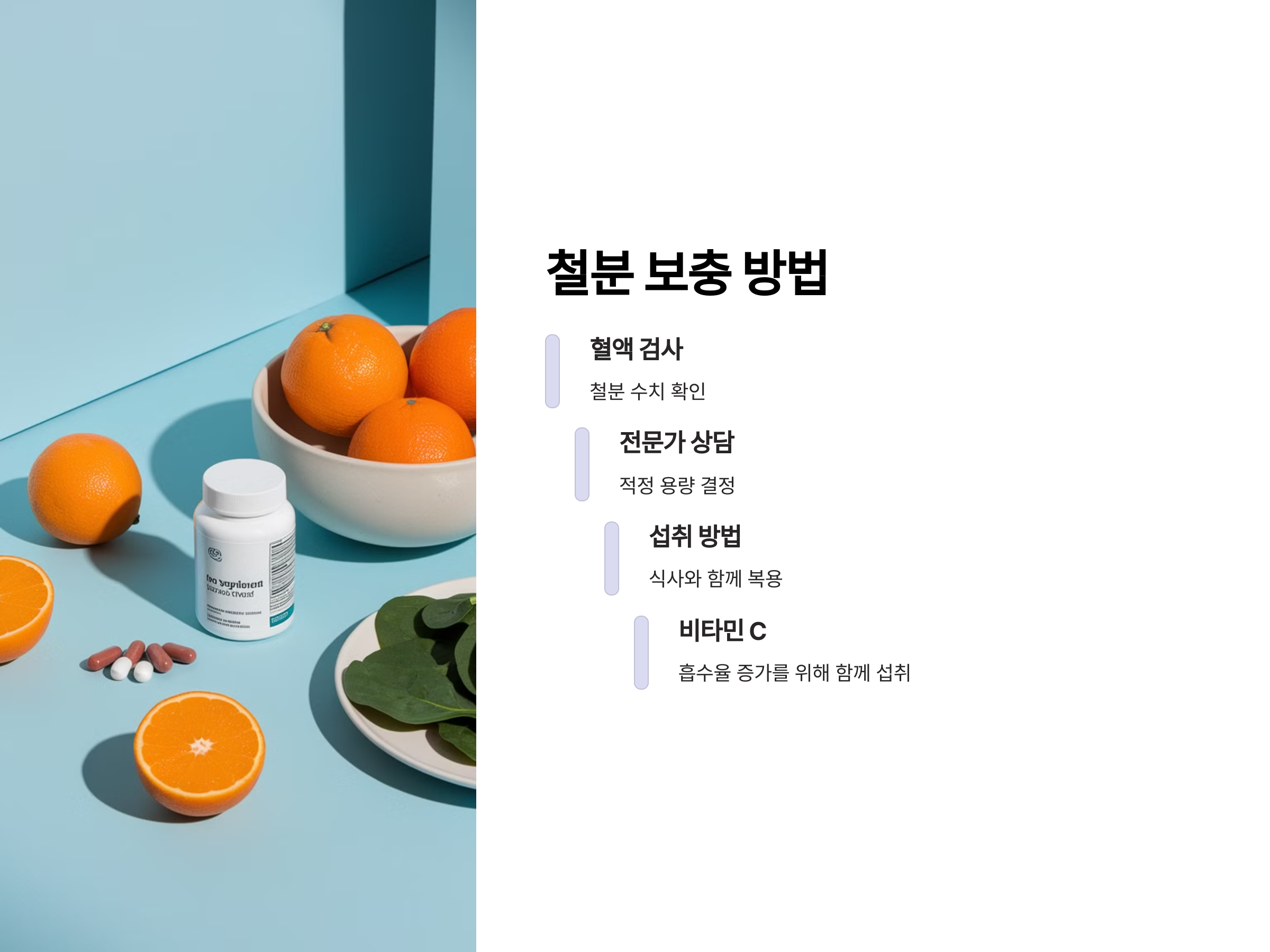 철분 보충을 시작하기 전에, 자신의 철분 수치를 정확하게 파악하는 것이 중요합니다. 혈액검사를 통해 철분 결핍이 있는지 확인하고, 결핍이 확인된 경우 전문가의 상담을 통해 적정한 용량을 결정해야 합니다. 철분 보충제는 종류가 다양하므로, 전문가의 지도 하에 섭취하는 것이 바람직합니다.