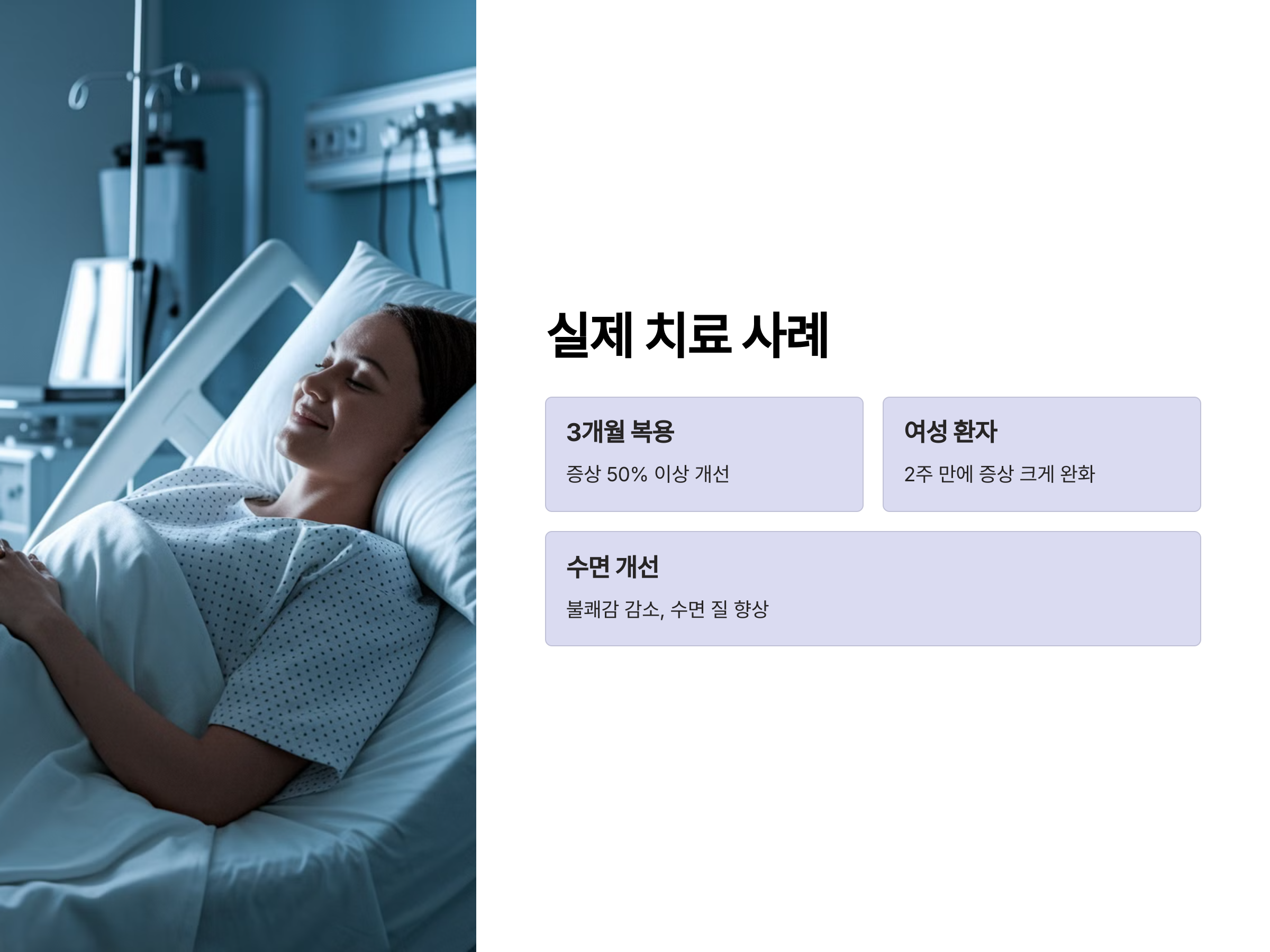 또 다른 사례에서는 여성 환자가 철분 결핍을 앓고 있었으며, 철분 보충제를 복용한 후 약 2주 만에 증상이 크게 완화되었습니다. 이 환자는 이전에 밤에 다리의 불쾌한 감각으로 잠을 이루지 못하였지만, 철분 보충 후 증상이 사라졌고, 수면의 질도 현저히 개선되었습니다.