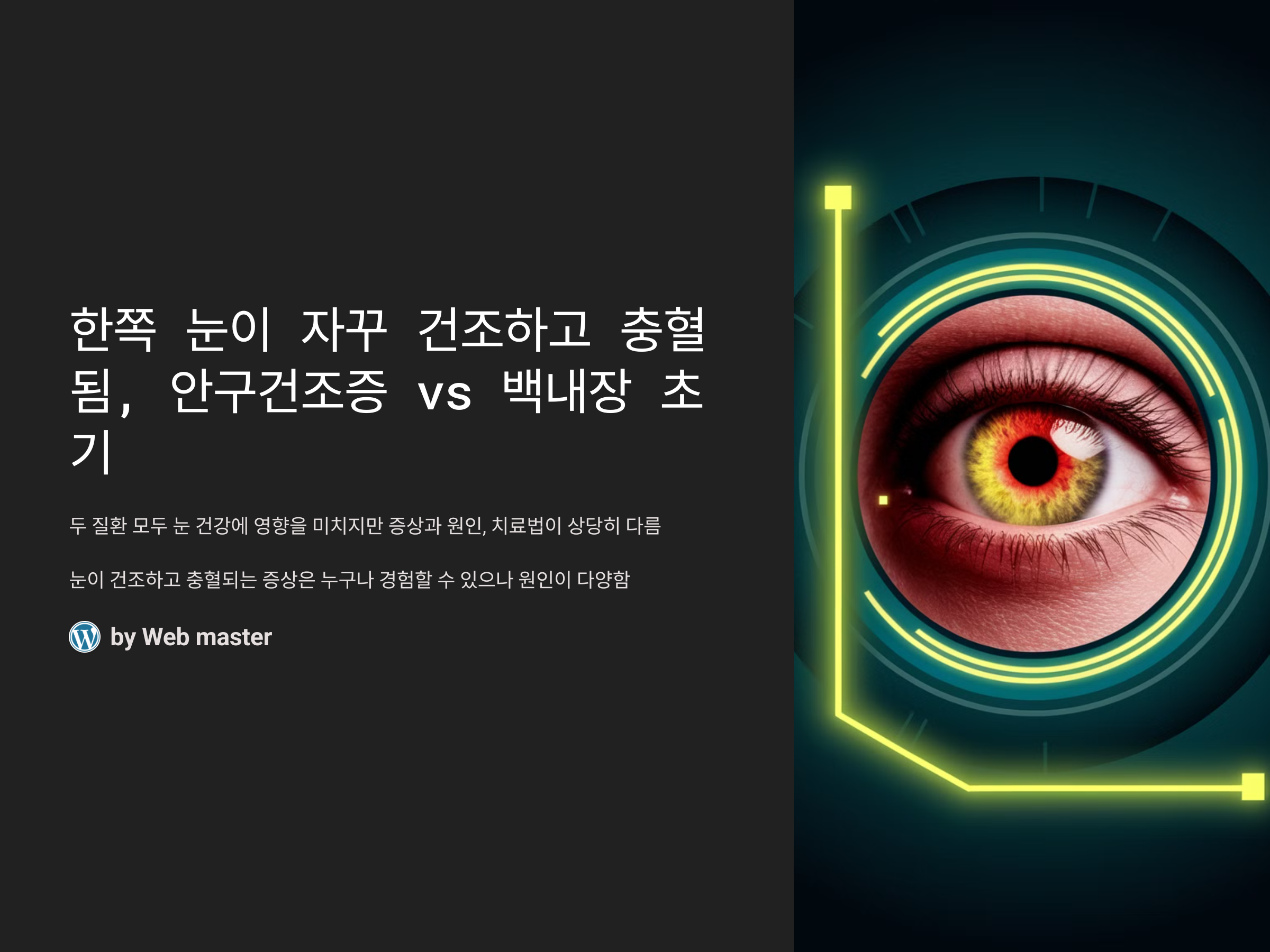 눈이 건조하고 충혈되는 증상은 누구나 한 번쯤 경험할 수 있지만, 그 원인은 매우 다양합니다. 특히 한쪽 눈에만 이런 증상이 반복된다면 더욱 신경이 쓰일 수 있습니다. 이러한 증상이 나타날 때 주로 의심되는 두 가지는 안구건조증과 백내장 초기입니다. 두 질환 모두 눈 건강에 영향을 미치지만, 그 증상과 원인, 치료법이 상당히 다릅니다. 이 글에서는 두 가지 질환의 차이점과 증상, 치료 방법에 대해 자세히 알아보겠습니다.