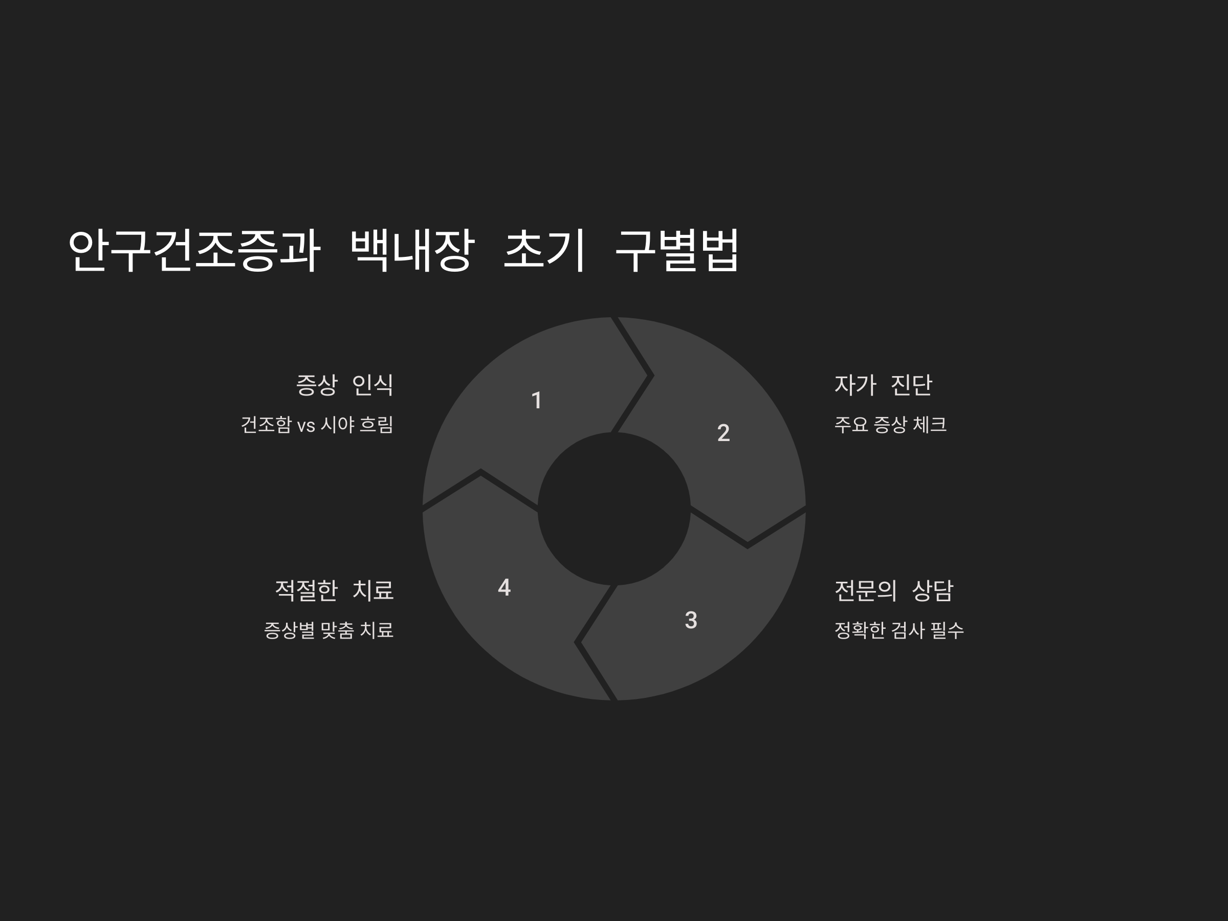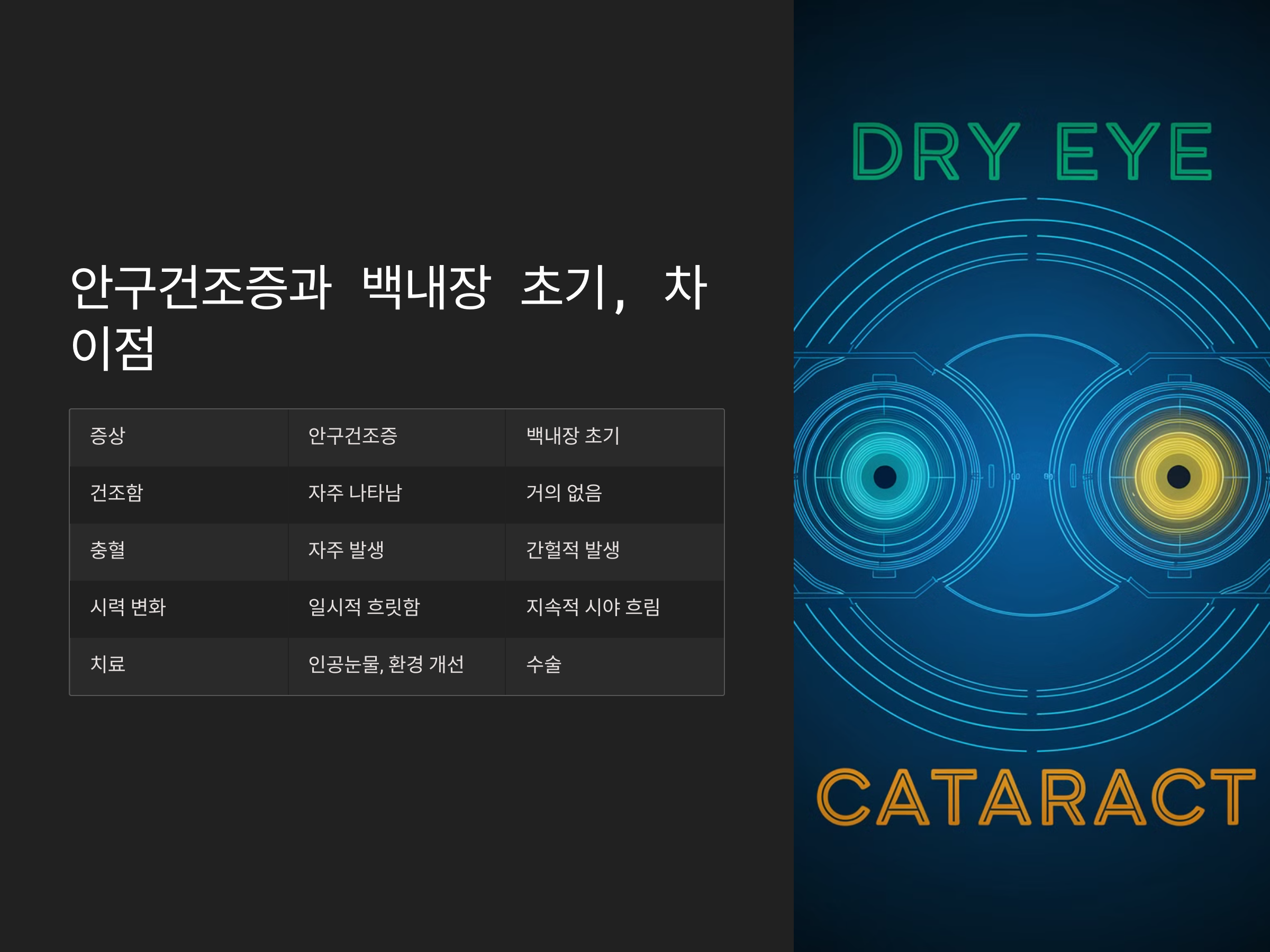 | 치료 방법 | 인공눈물, 환경 개선, 약물 | 수술(백내장 제거 및 인공 수정체 삽입) |