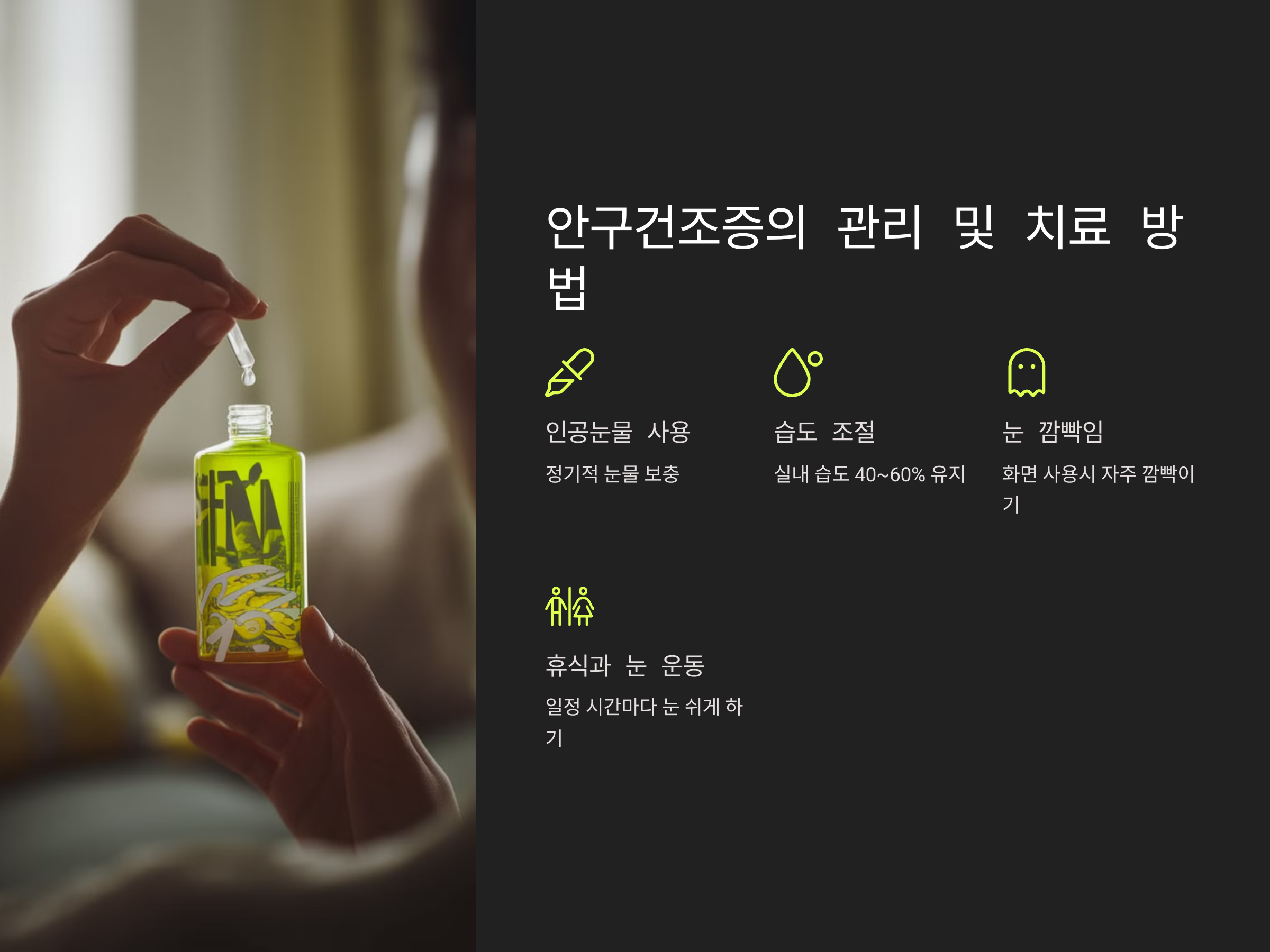 - 인공눈물 사용: 눈물이 부족하면 인공눈물로 수시로 눈에 윤활제를 공급합니다.