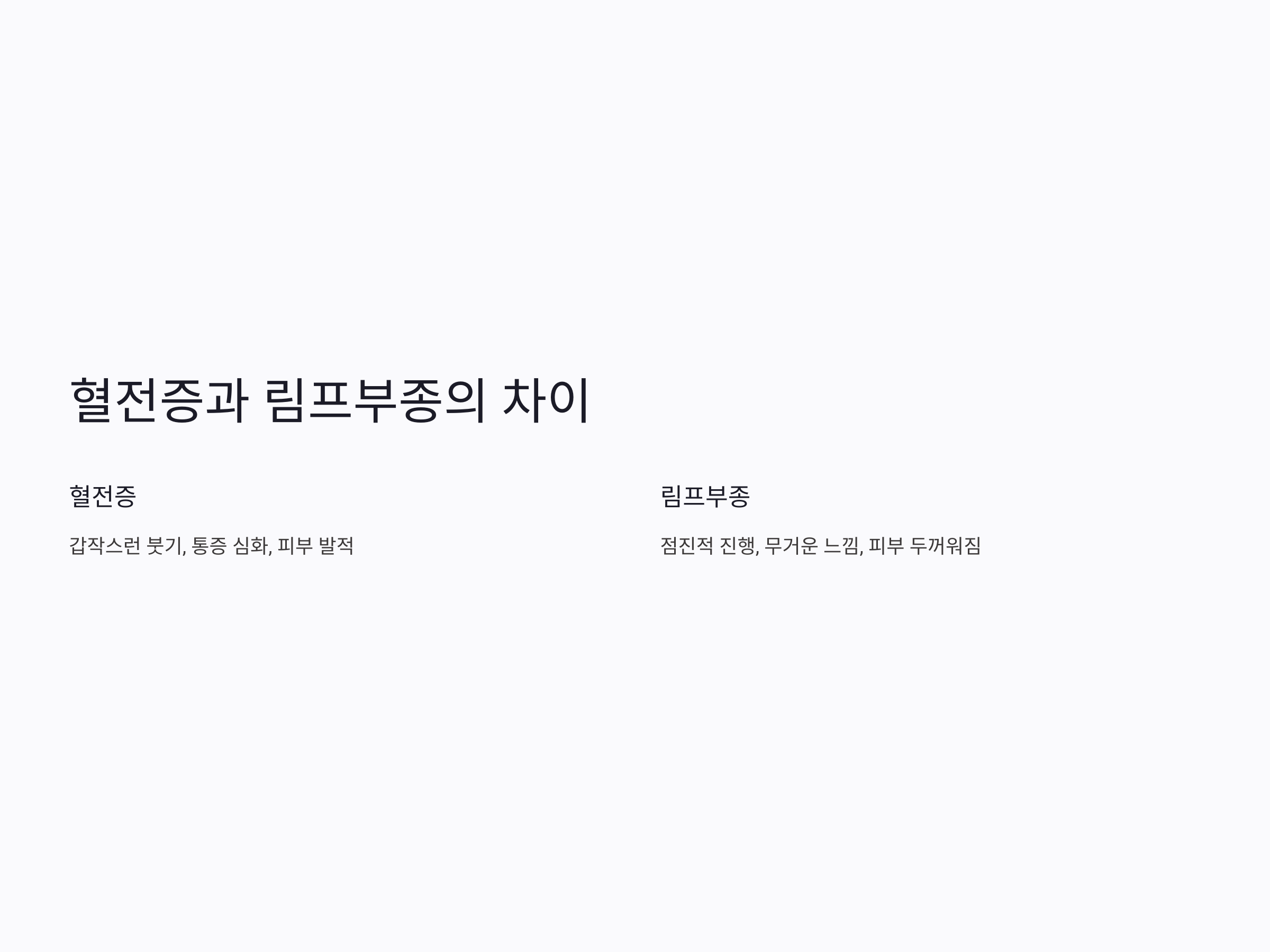 혈전증과 림프부종은 증상에서 유사한 부분이 있지만, 다음과 같은 차이점이 있습니다.
