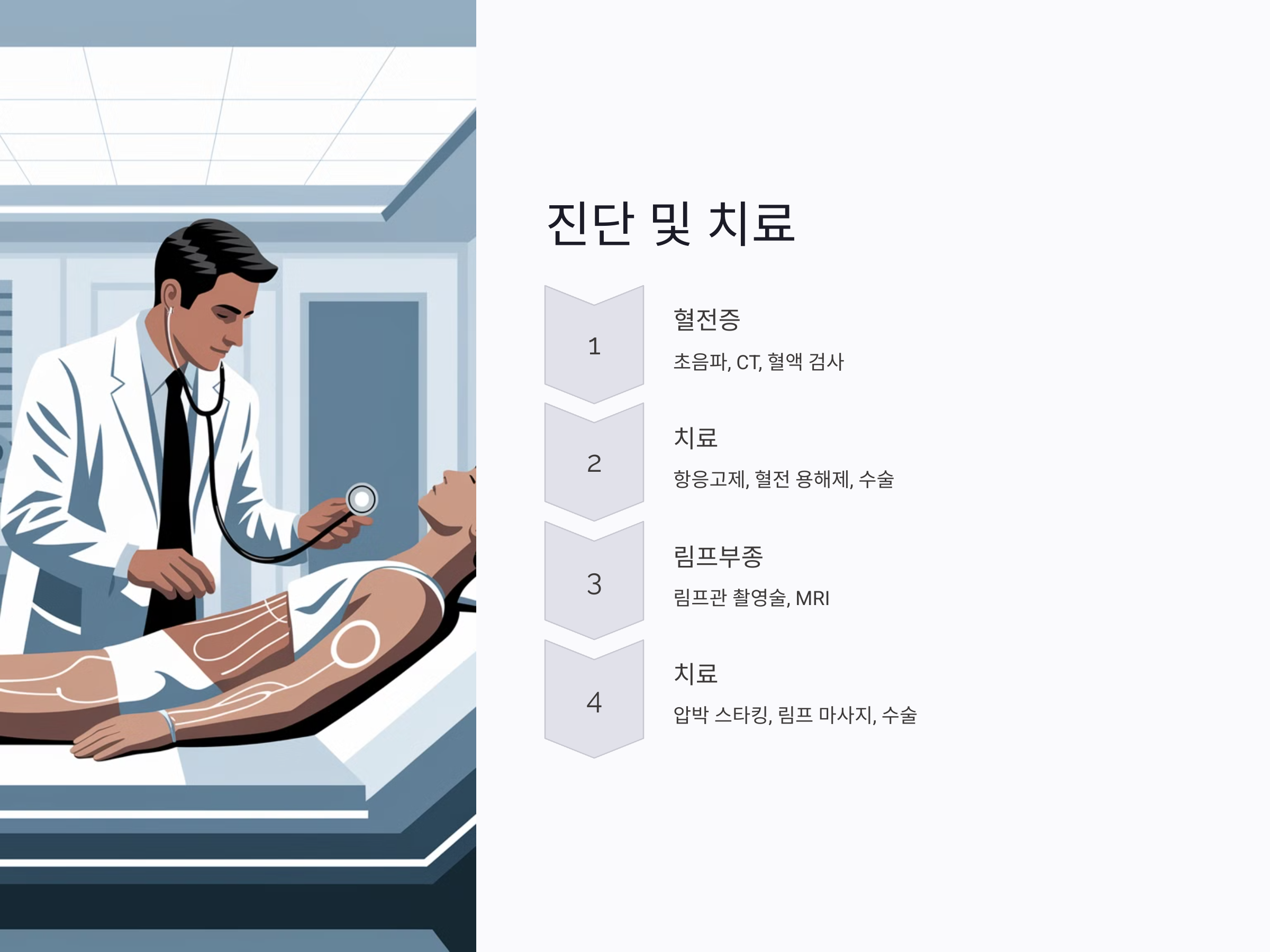 A: 혈전증이 의심되면 절대로 자가 치료를 하지 말고, 즉시 병원에 가서 검사를 받는 것이 중요합니다. 병원에서는 초음파 검사를 통해 정확한 진단을 내릴 수 있습니다.