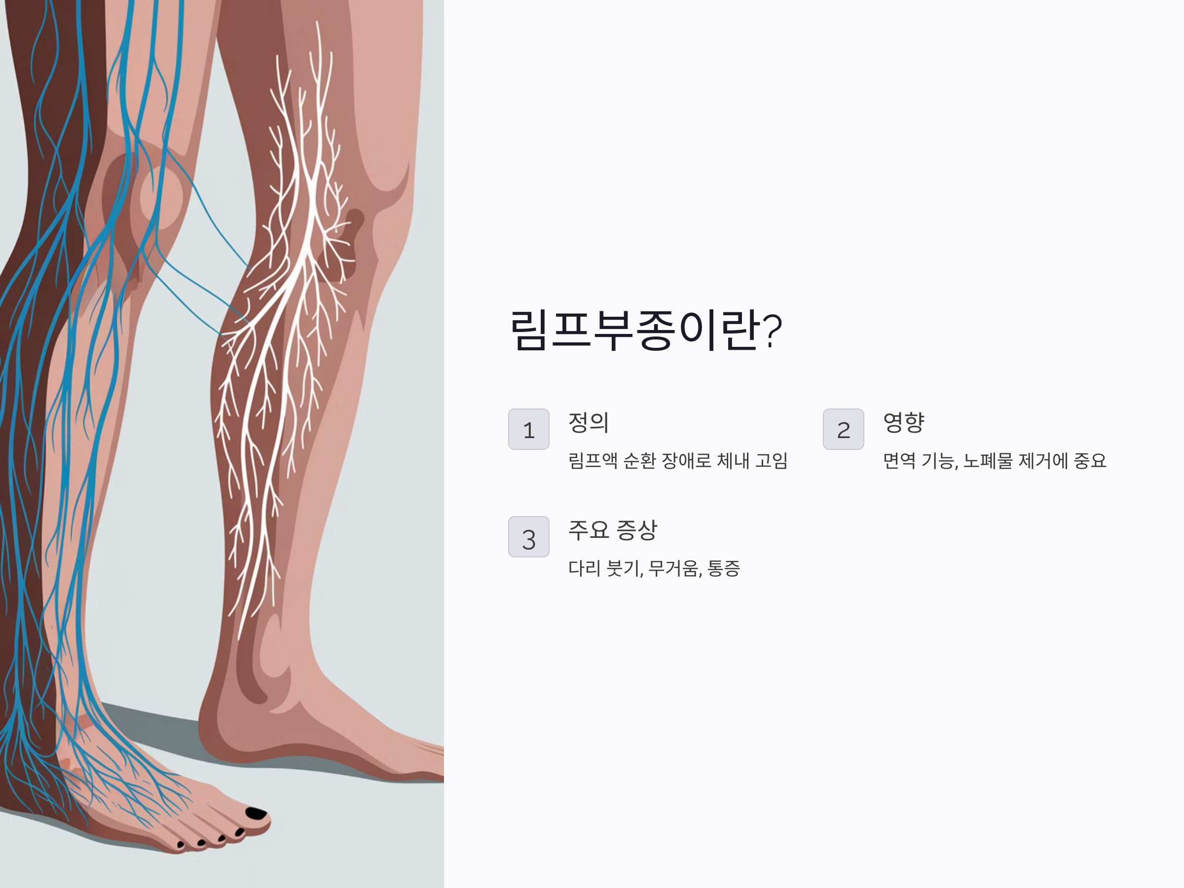 림프부종은 림프액이 정상적으로 순환하지 못하고 체내에 고여서 발생하는 상태입니다. 림프는 면역 기능과 체내 노폐물 제거에 중요한 역할을 합니다. 이 림프액이 혈관 내에서 흐르지 못하고 고일 때, 주로 다리가 붓고 무겁고 아픈 증상이 발생합니다.