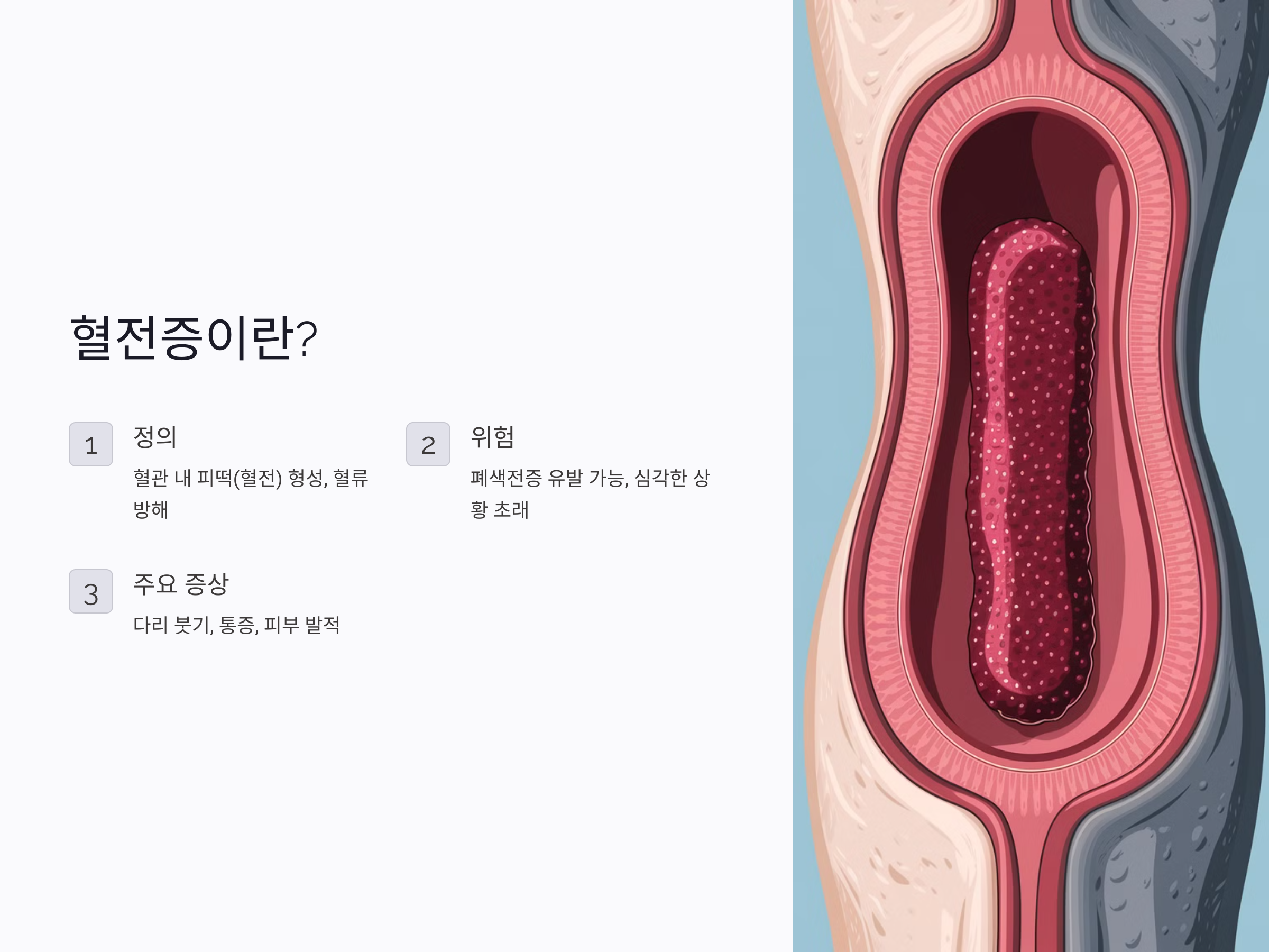 혈전증은 혈관 내에 피떡(혈전)이 형성되어 혈류를 방해하는 상태를 의미합니다. 대개 심부정맥혈전증(DVT)이라 불리는 질환이 대표적입니다. 이 질환은 다리 깊은 혈관에 혈전이 생기면서 통증과 붓기를 유발합니다. 혈전이 이동해 폐에 도달하면 폐색전증을 일으킬 수 있어 심각한 상황으로 이어질 수 있습니다.