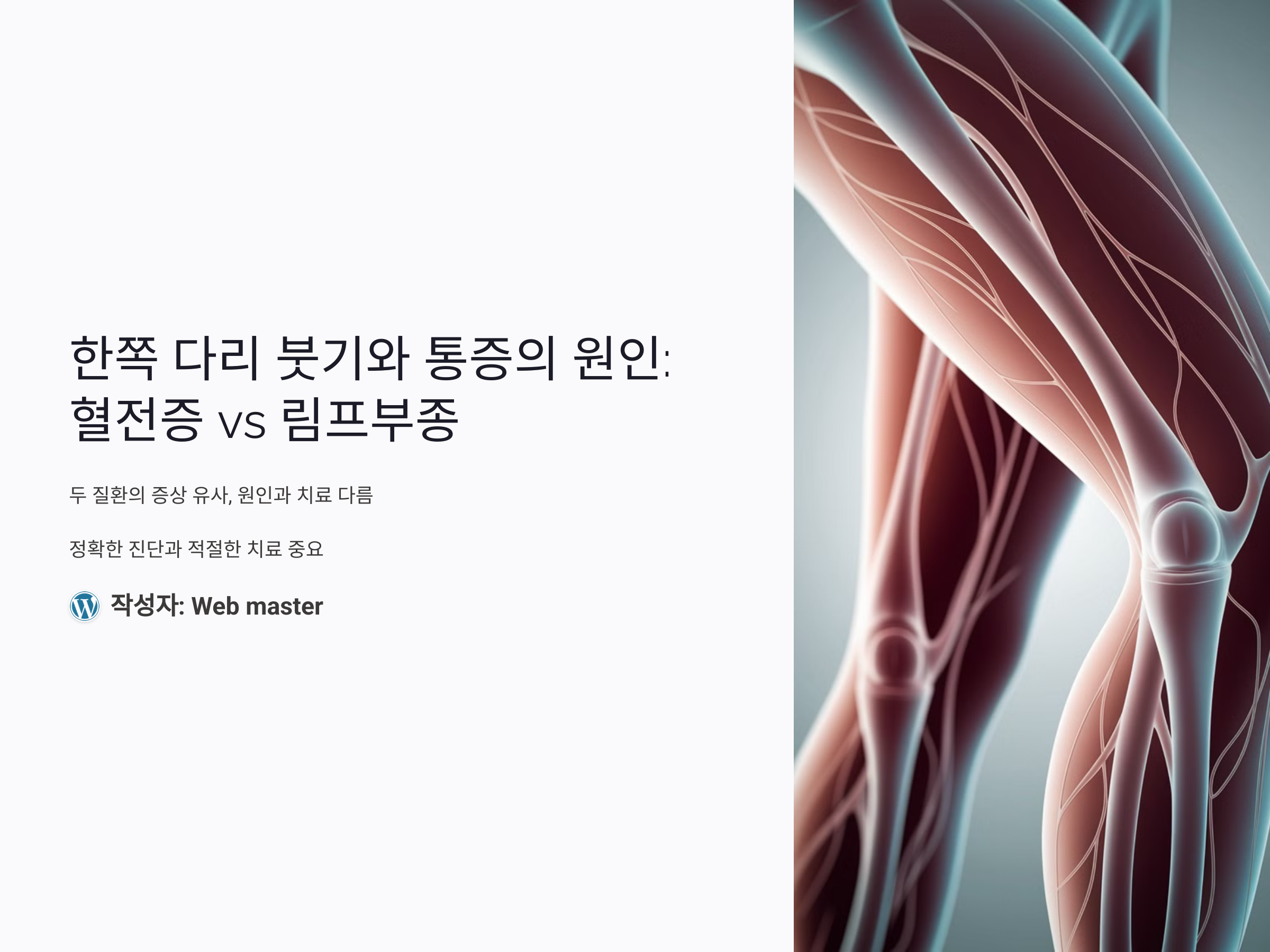 한쪽 다리가 붓고 걸을 때 통증이 심하다면, 혈전증과 림프부종 두 가지 질환이 주요 원인으로 의심될 수 있습니다. 이 두 가지 질환은 증상이 유사할 수 있지만, 원인과 치료 방법이 다르기 때문에 구분하는 것이 중요합니다.