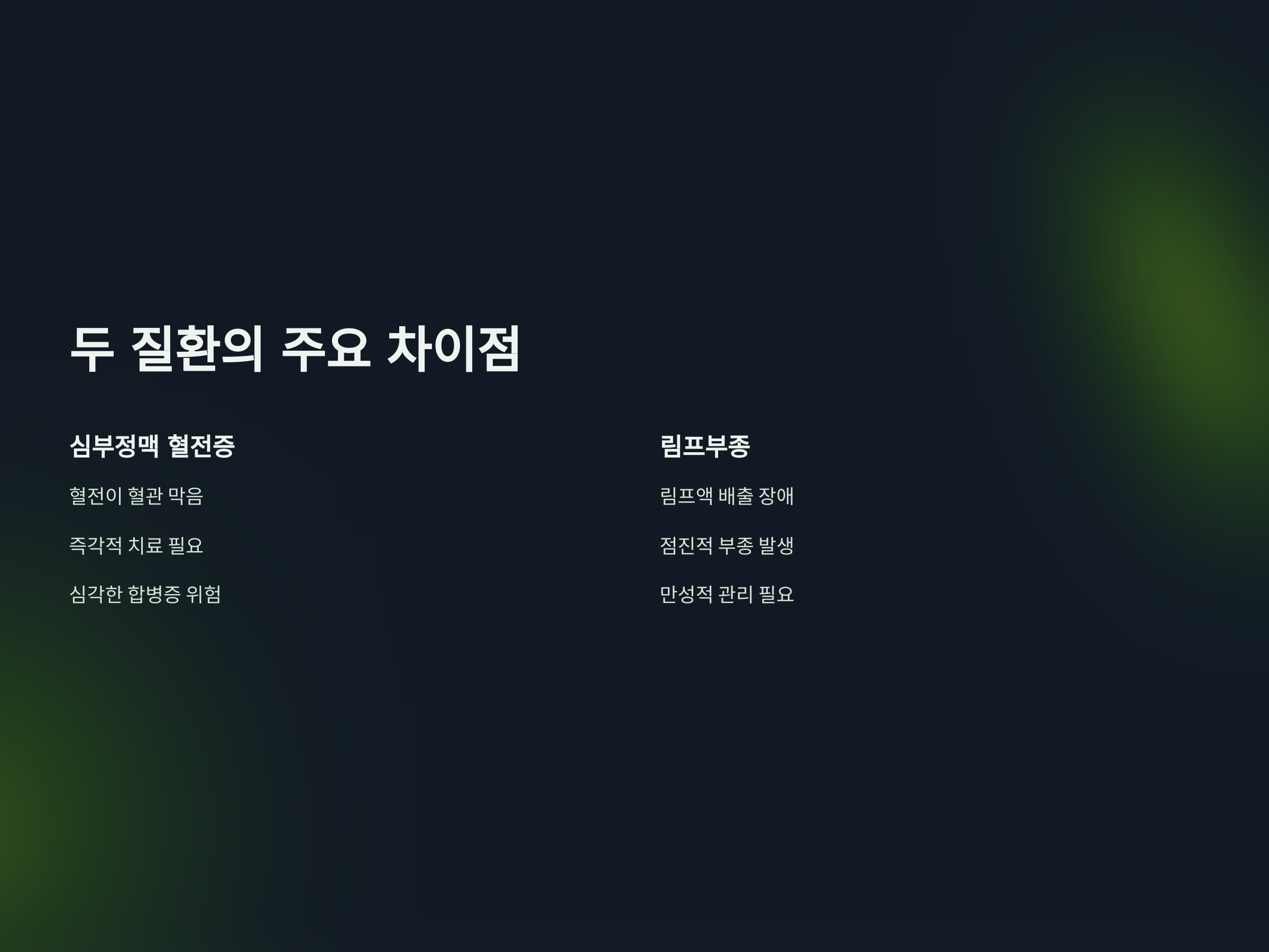 심부정맥 혈전증(DVT)과 림프부종은 다리 붓기와 통증을 동반하지만, 그 원인과 치료 방법은 다릅니다. 심부정맥 혈전증은 혈전이 혈관을 막아 발생하는 질환으로, 즉각적인 치료가 필요합니다. 반면, 림프부종은 림프액의 배출 장애로 인해 발생하는 부종으로, 다리가 붓고 무거운 느낌을 주지만, 혈전과는 다른 원인에 의해 발생합니다. DVT는 혈액이 응고되는 문제이고, 림프부종은 림프액 순환의 문제입니다. 두 질환 모두 부종을 동반하지만, DVT는 심각한 합병증을 일으킬 수 있어 더 긴급한 치료가 필요합니다.