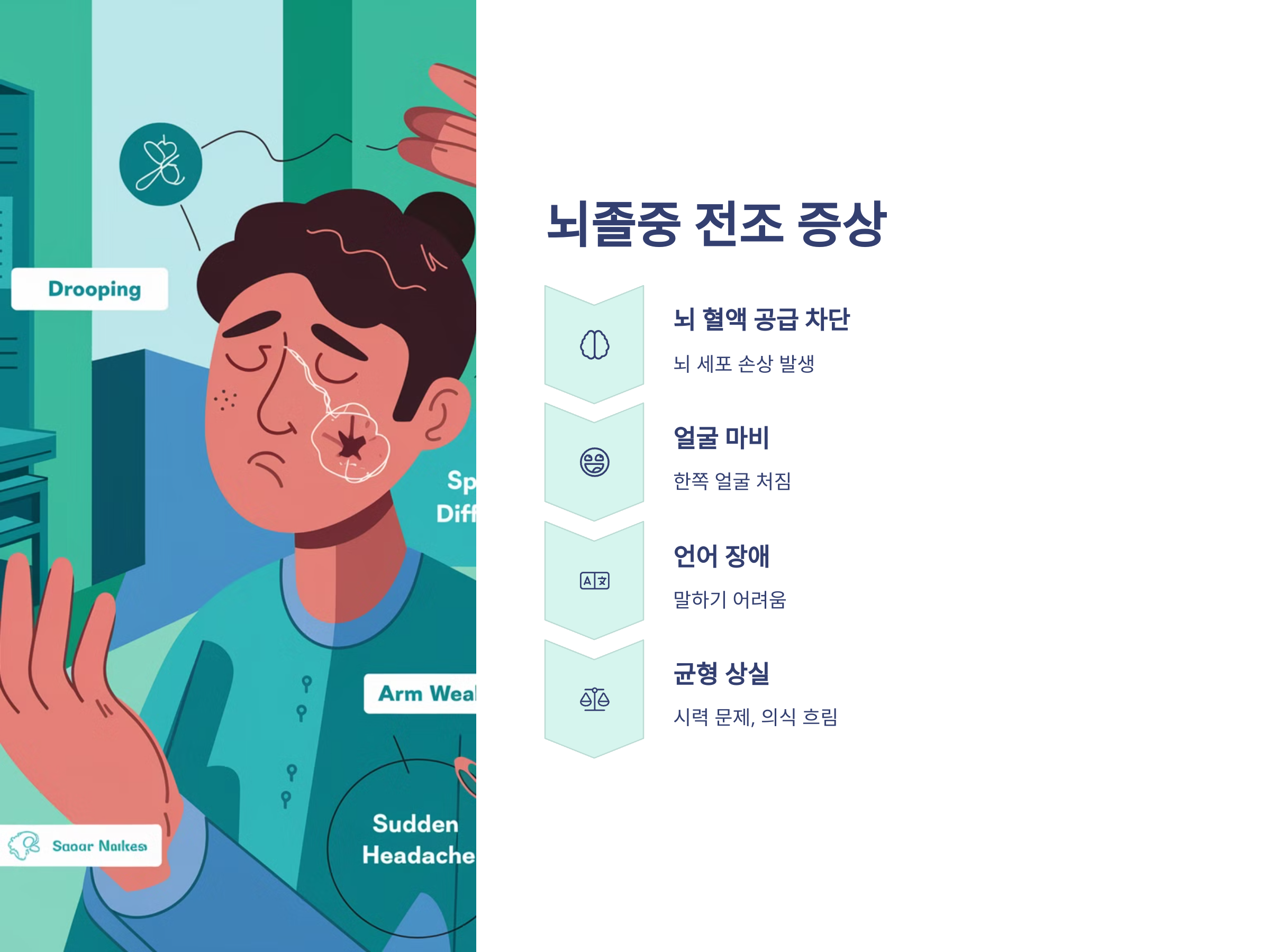 뇌졸중 전조 증상은 갑작스럽고 급격히 발생하는 경향이 있으며, 일반적으로 얼굴이 한쪽으로 처지거나 말이 어눌해지는 등의 증상이 동반됩니다. 뇌졸중이 발생한 경우, 즉시 응급처치를 받고 병원에 가야 합니다.